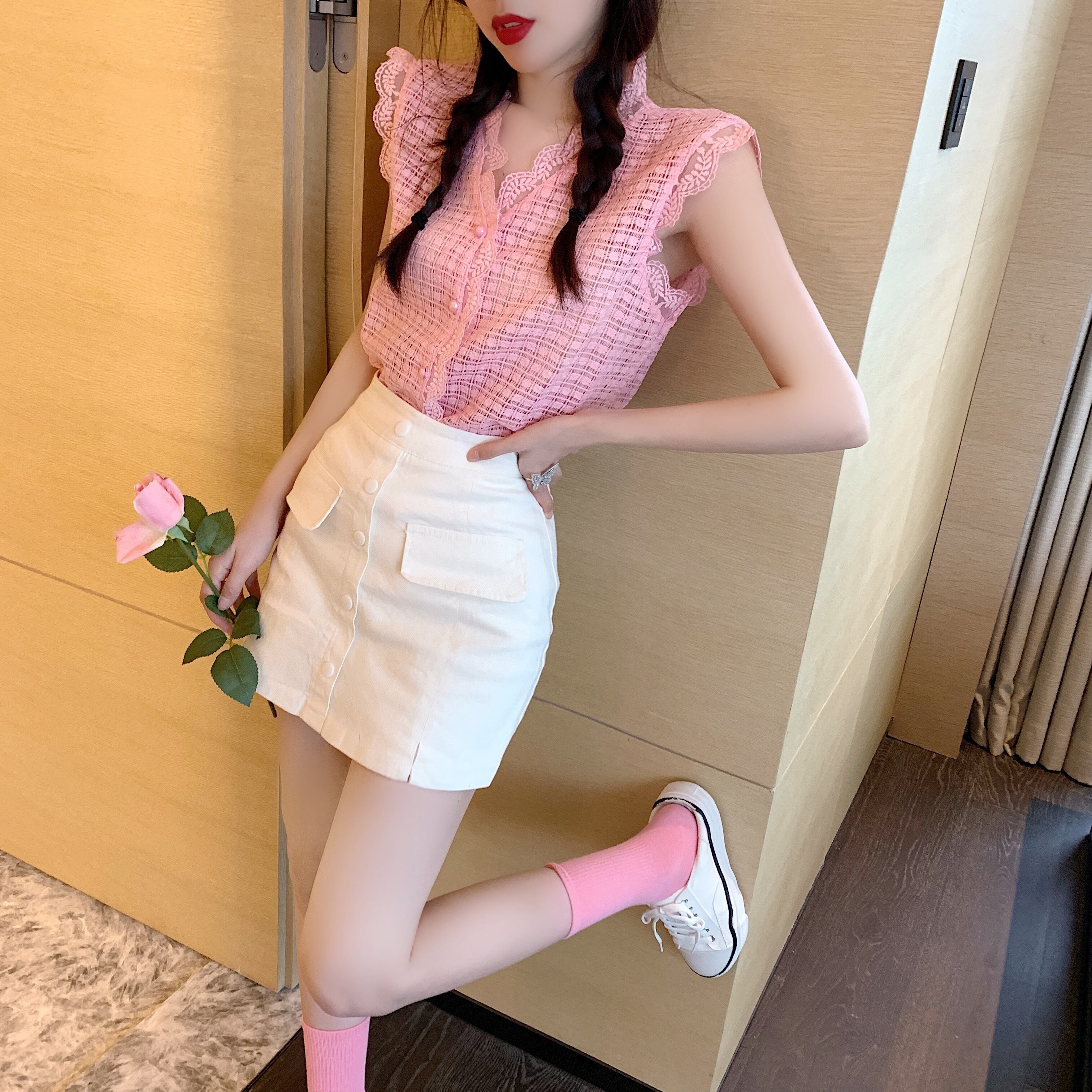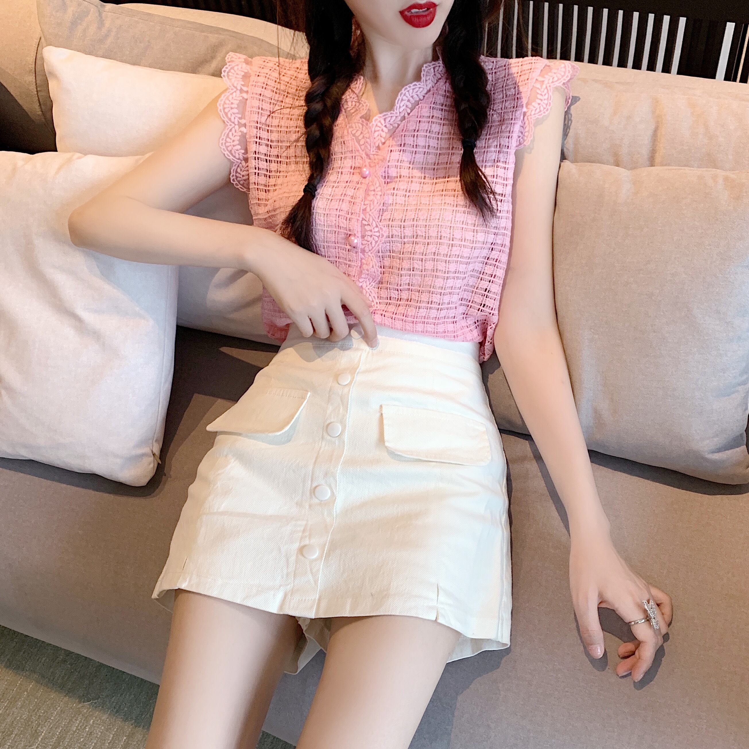 スタイルサマーレースブラウス ハイウェストウェストAラインスカート 大人ガーリー スウィート キュート カジュアル 夏物 Xiaofeijia38587842926