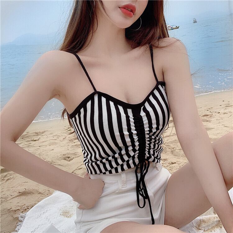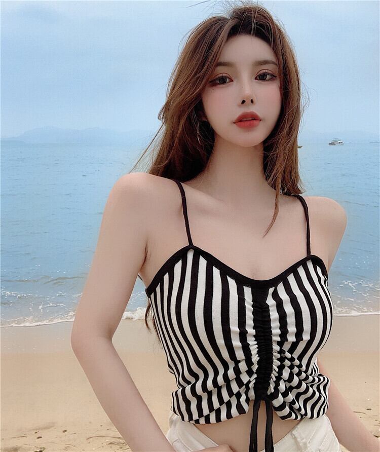 スタンダードブラックホワイトストライプレディースレッドギャザーVネックショートトップス レトロ サマー 夏物 Xiaofeijia32072172628