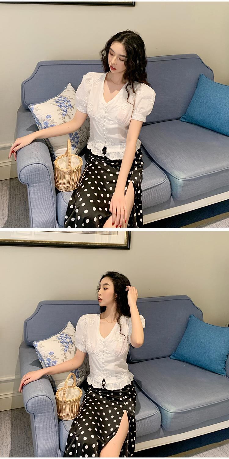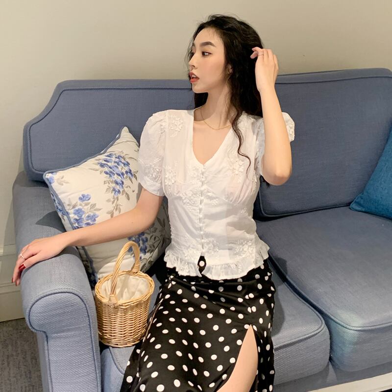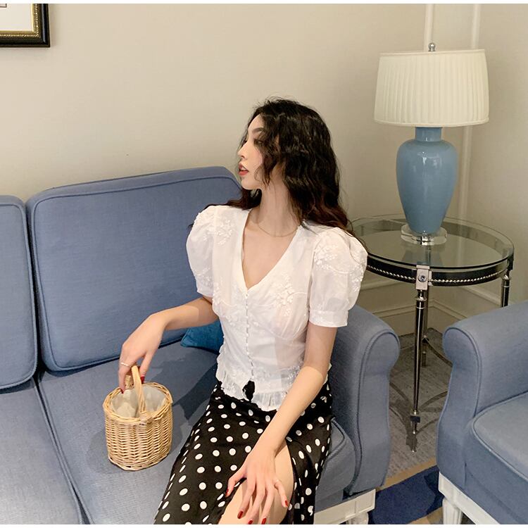 スタンダードハイウェストウェストショートVネックスリーブレースシャツ ホワイトトップス レトロ Xiaofeijia91552961231
