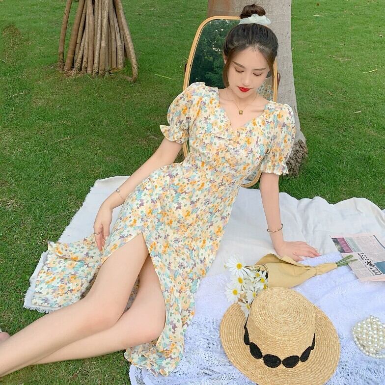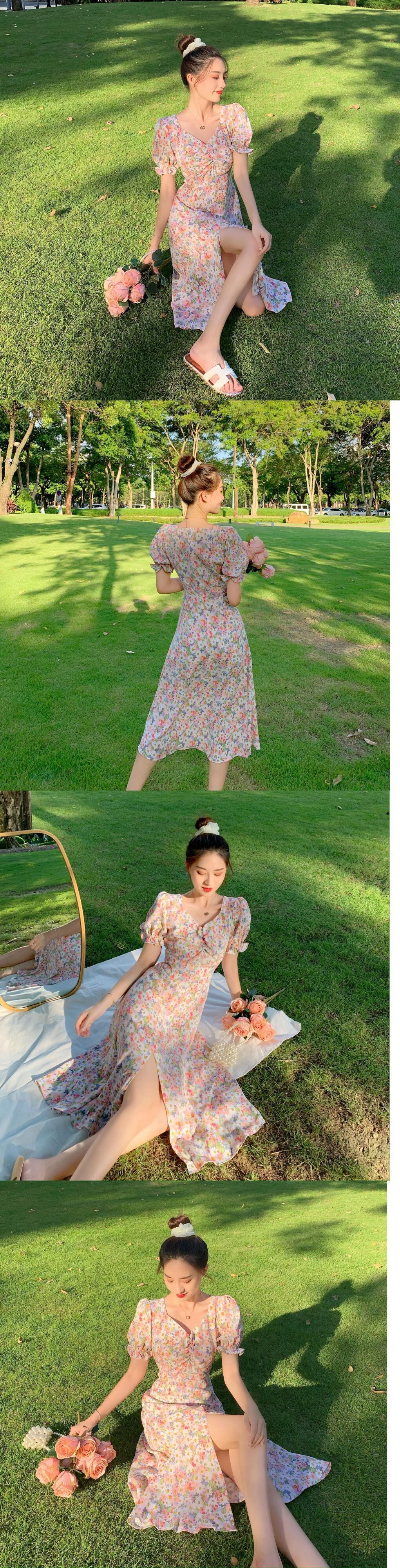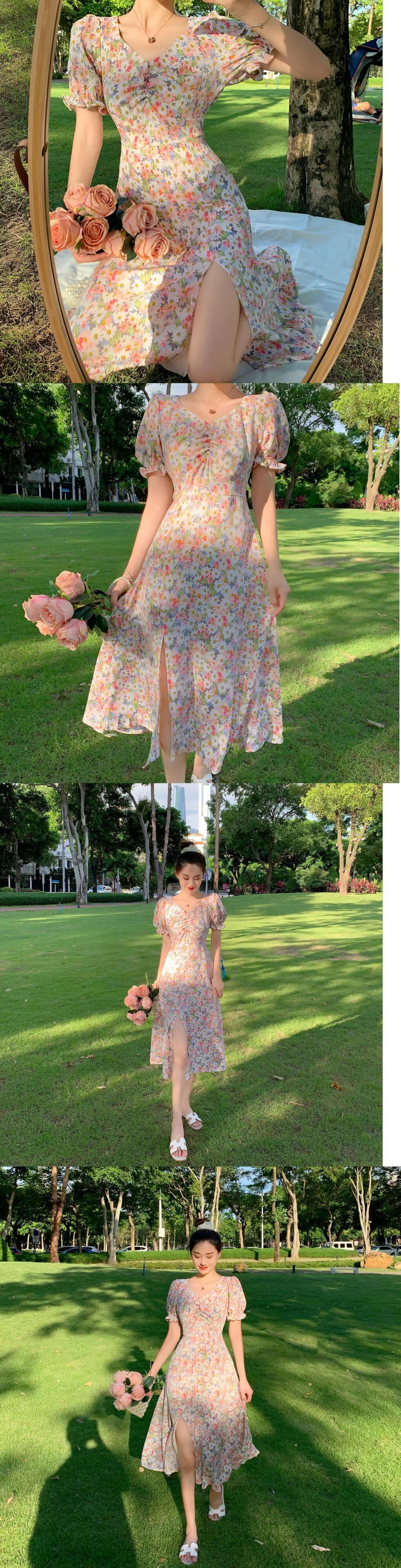 スプリングスリットフローラルドレス ロング半袖スリーブVネックスカート Aライン ショート ハーフスリーブ 春物 花柄 Xiaofeijia75196385395