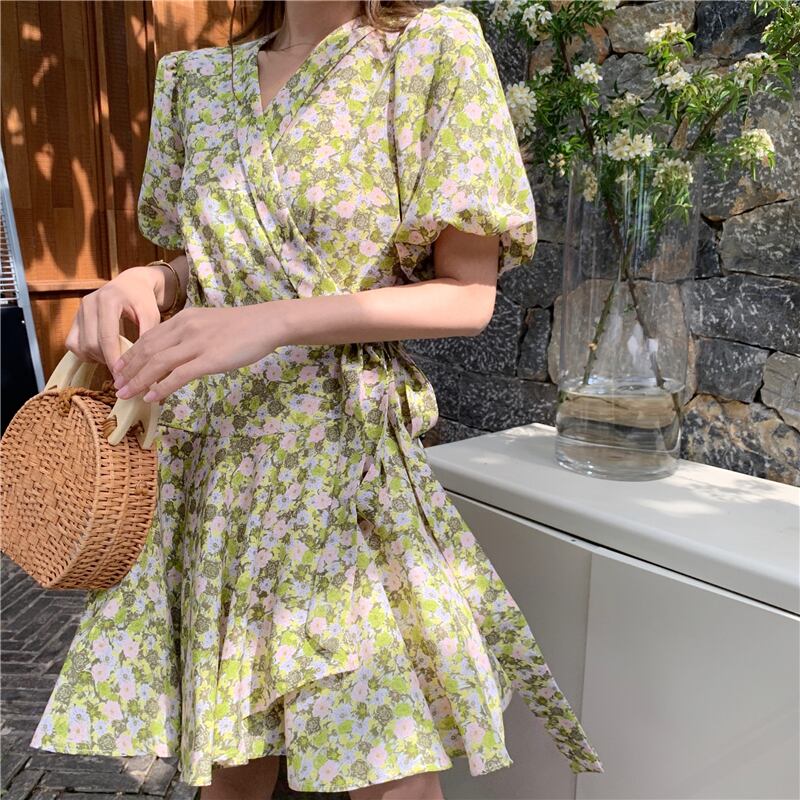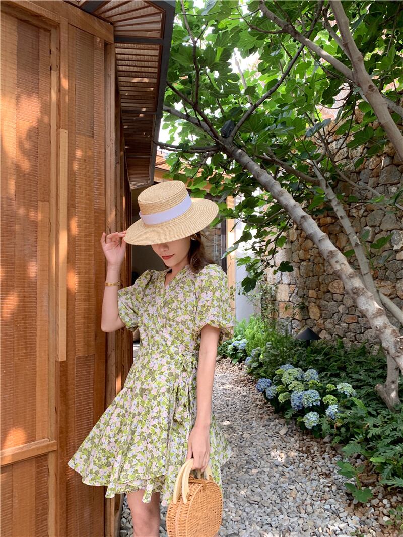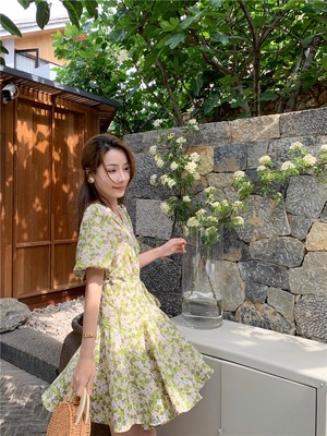 リボンフローラルドレス サマースタイルスリーブワンピースレースAラインショートスカート 夏物 花柄 Xiaofeijia49764562597