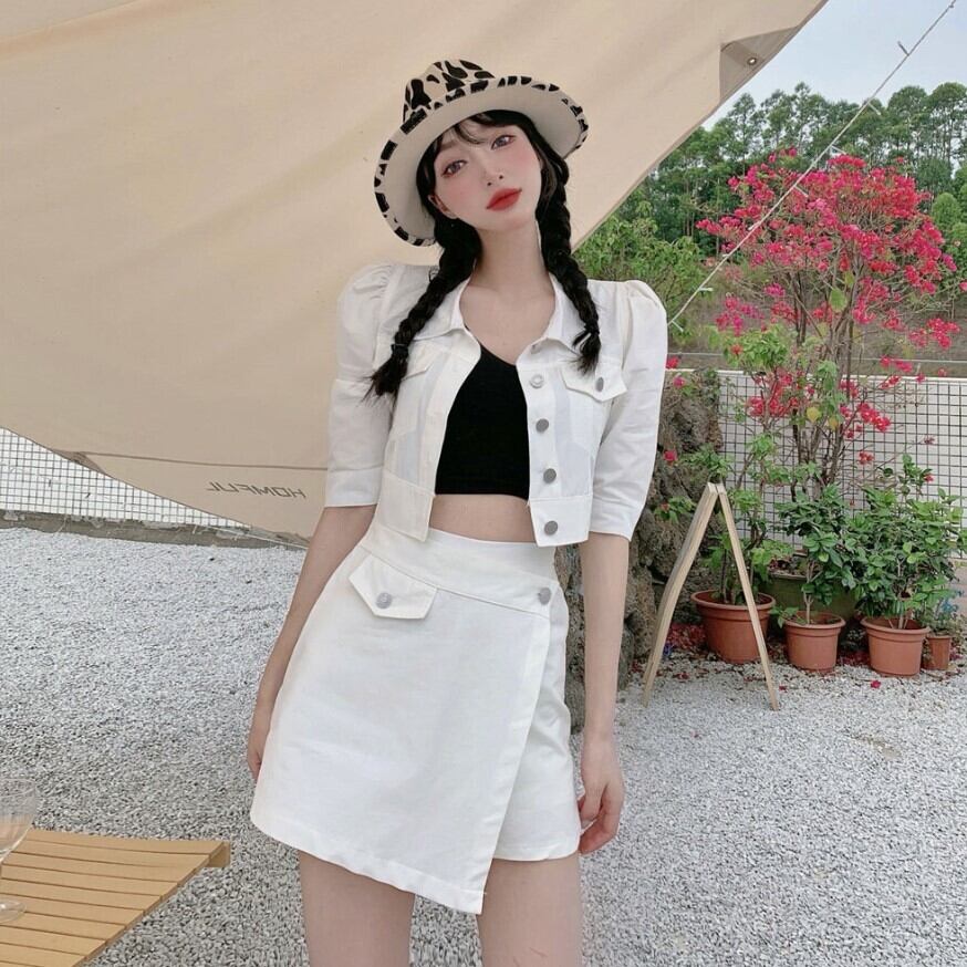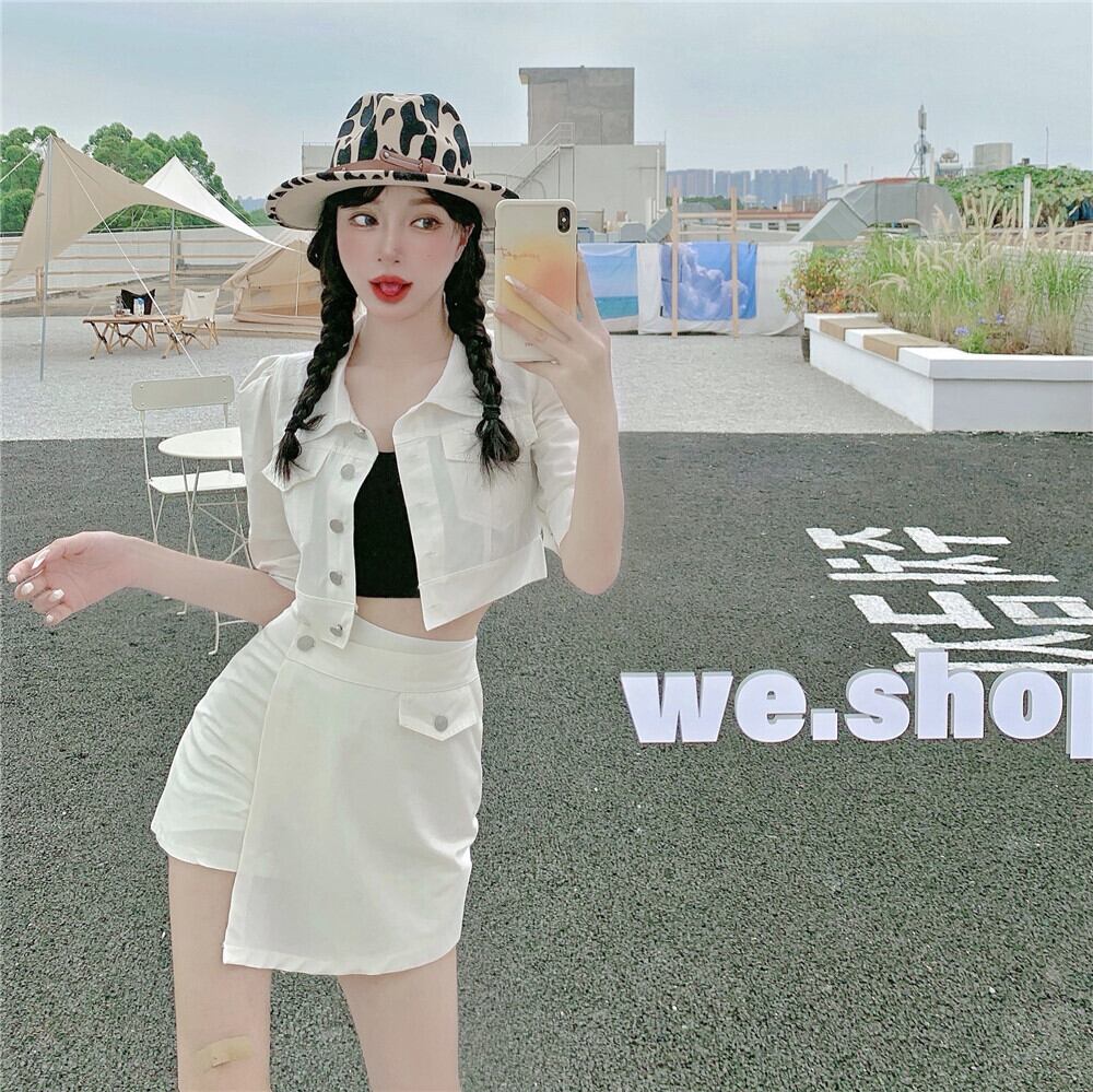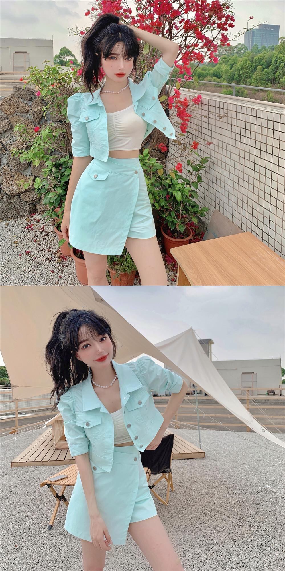 サマースリーブショートトップス ウェストスカート ツーピース セット 夏物 Xiaofeijia30100160995