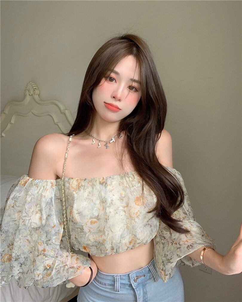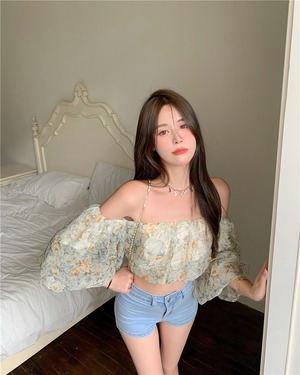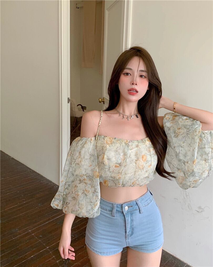 フローラルスリーブトップス サマーストラップレスショートシャツ ランタンスリーブ 大人ガーリー スウィート キュート カジュアル 夏物 花柄 Xiaofeijia79020635559