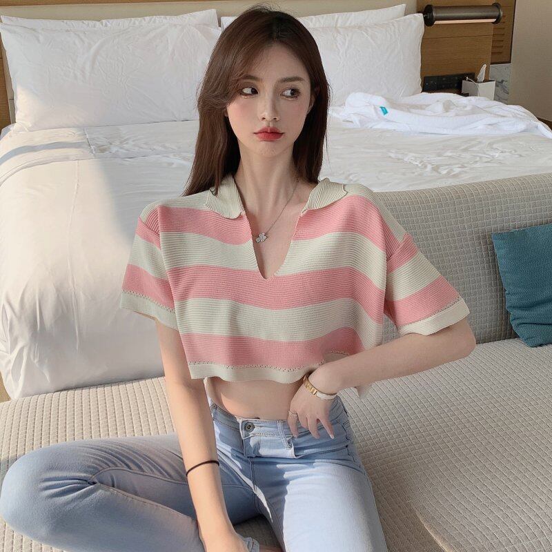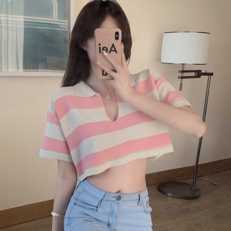 スタイルカラーストライプショートトップス サマーVネックルーズクロップドTシャツ 大人ガーリー スウィート キュート カジュアル 夏物 Xiaofeijia40906106357