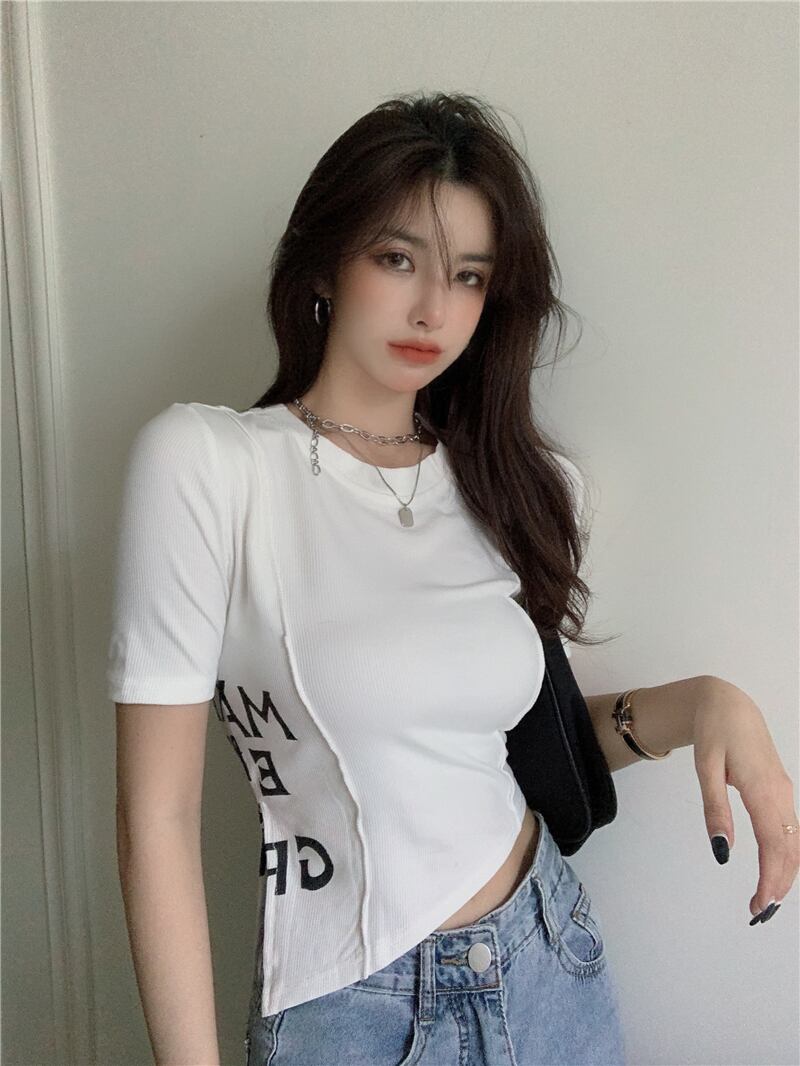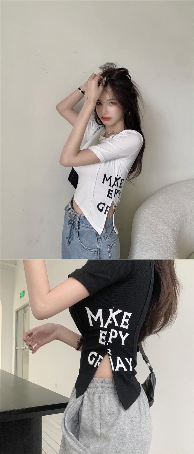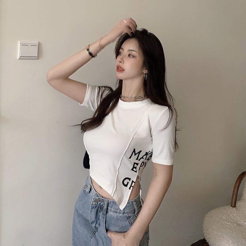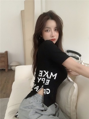 ショートトップス サマーストレッチサイドウェストTシャツ レッド エラスティック 伸縮 夏物 Xiaofeijia60771697613