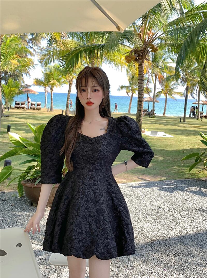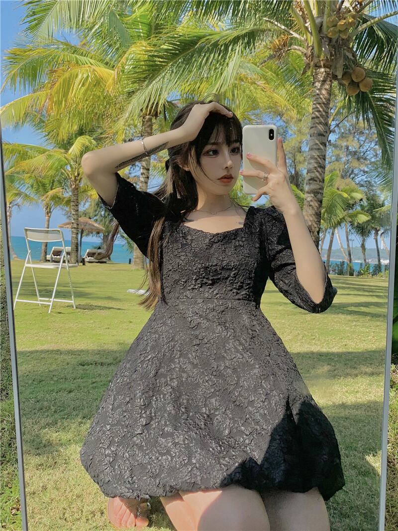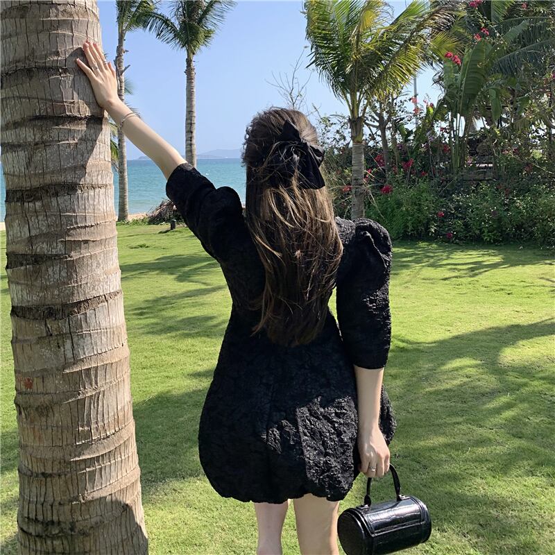 プリント柄スリーブブラックドレス ハイウェストウェストスリムショートスカート Xiaofeijia66982603561