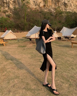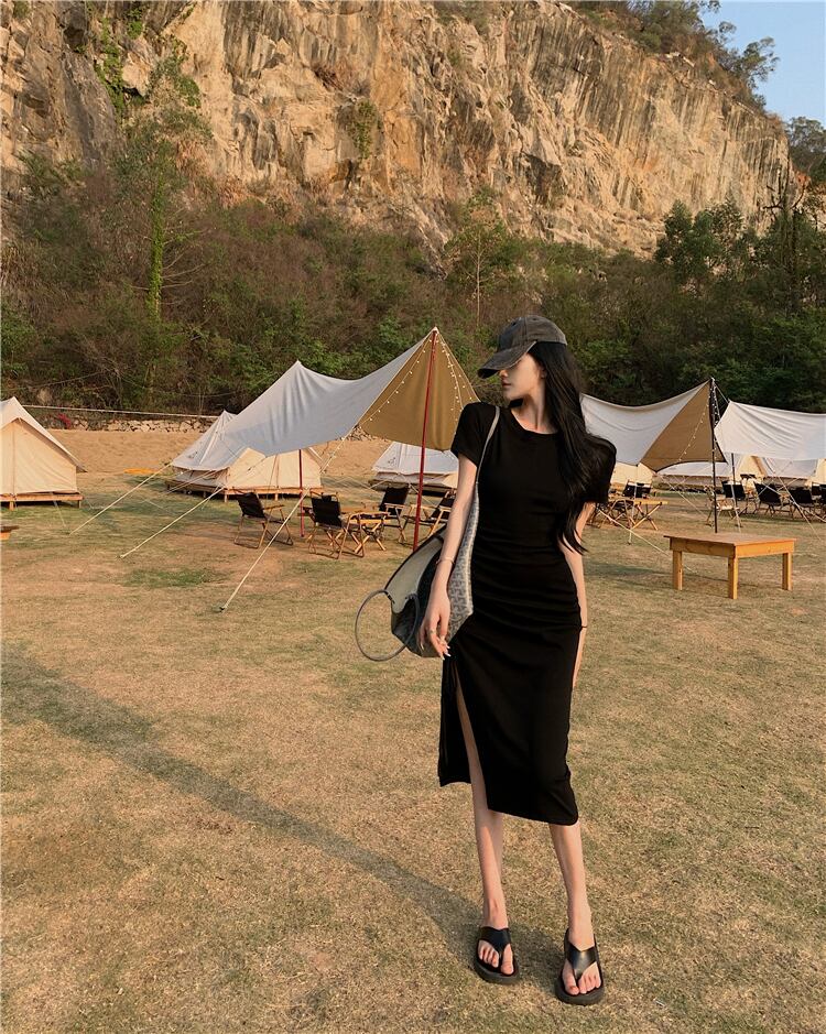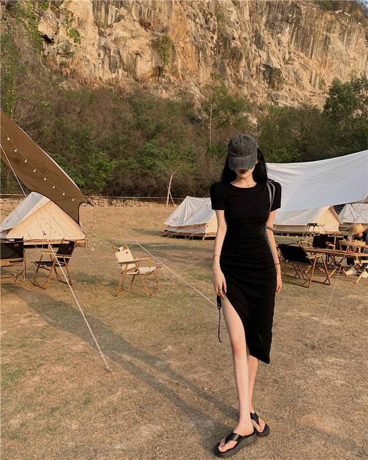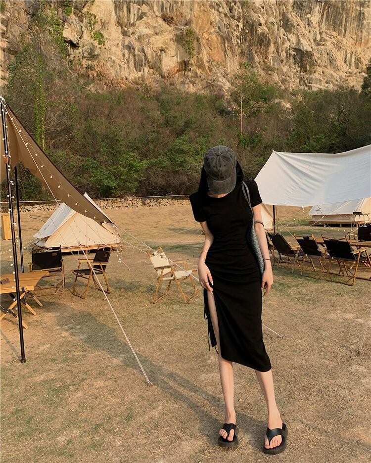 プリーツサイドスリットTシャツ ドレス スリムブラックスカート レース レースアップ Xiaofeijia21785497858
