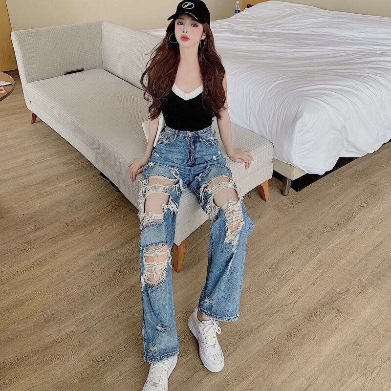 ジーンズ パンツ サマールーズスタイルワイドレッグハイウェストウェストロング 夏物 ワイドパンツ Xiaofeijia53963521894