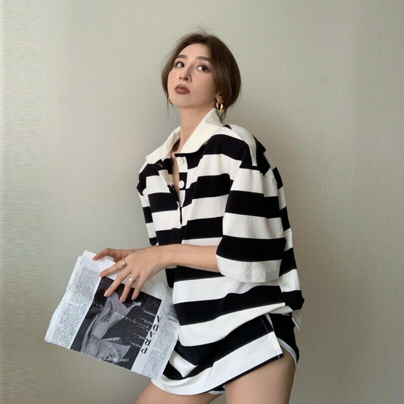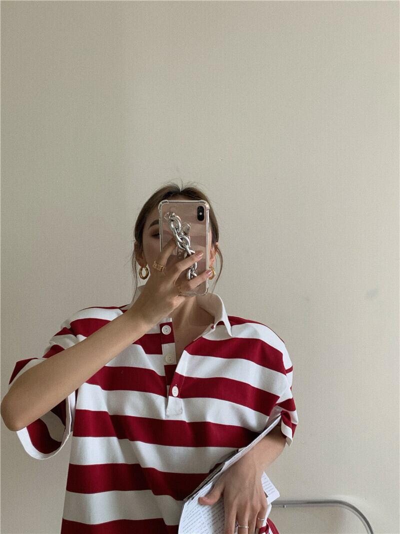 ルーズストライプシャツ レディースサマーレッドTシャツ トップス 夏物 Xiaofeijia51299544635