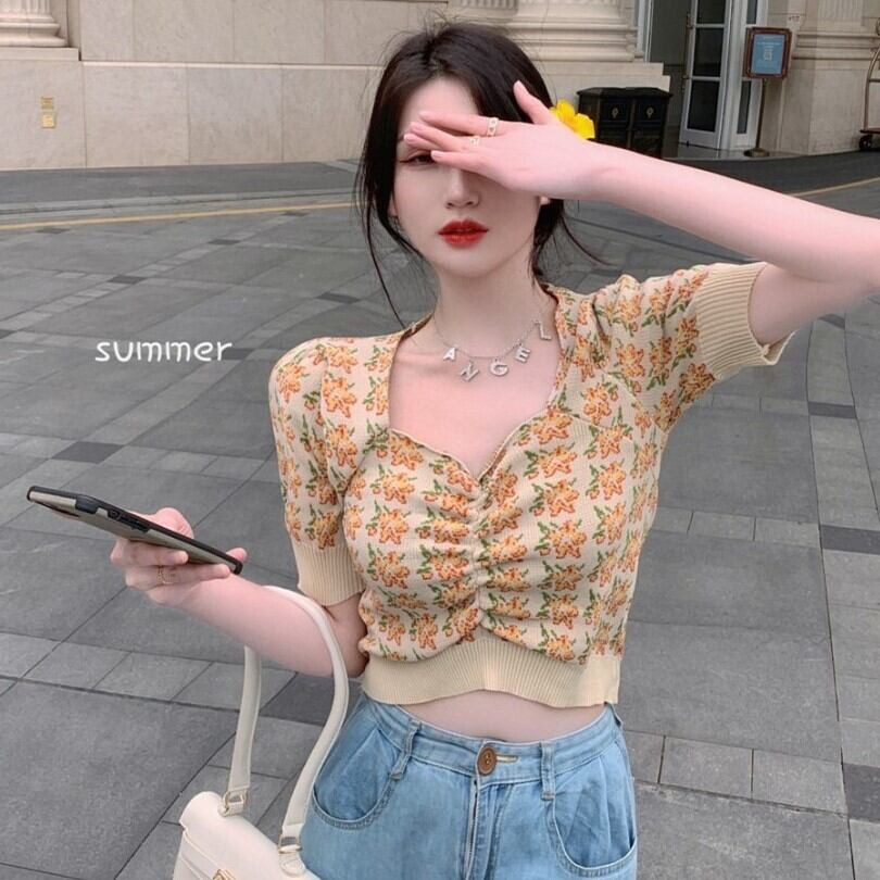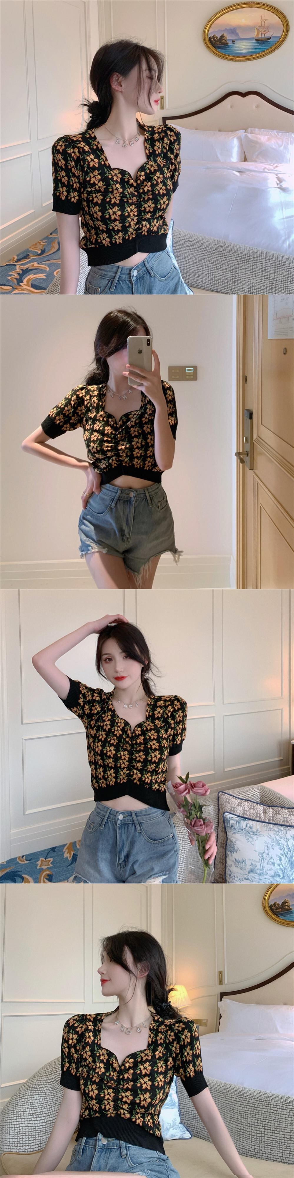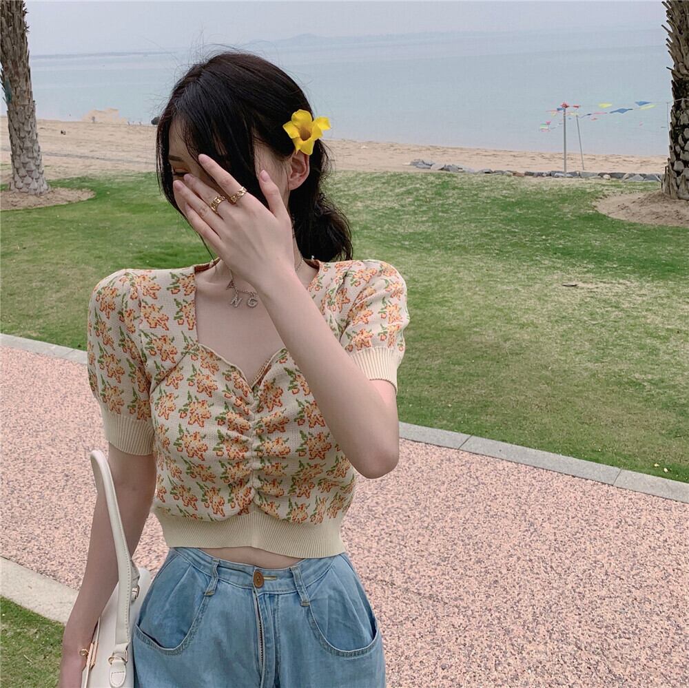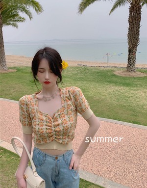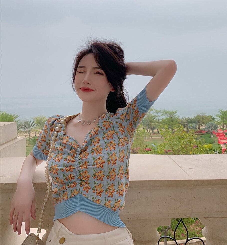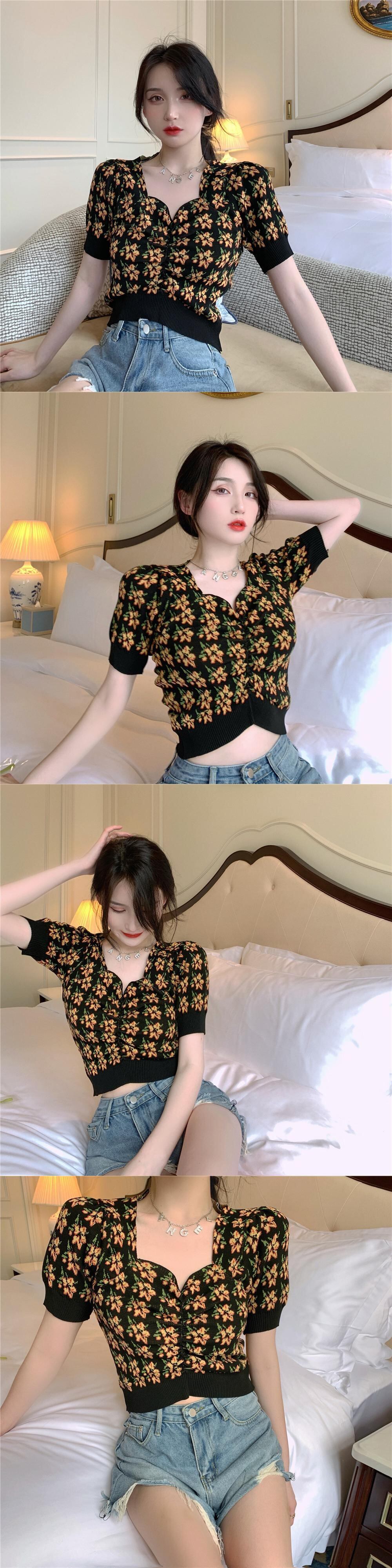 スタイルトップス サマーショートVネックセーター ブラウス 夏物 フラワーデザイン Xiaofeijia2305059747
