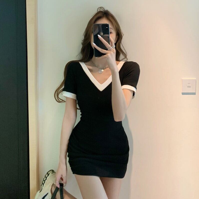 Vネックカラープリーツドレス スリムショートウェストスカート サマースタイル 夏物 Xiaofeijia56659269772