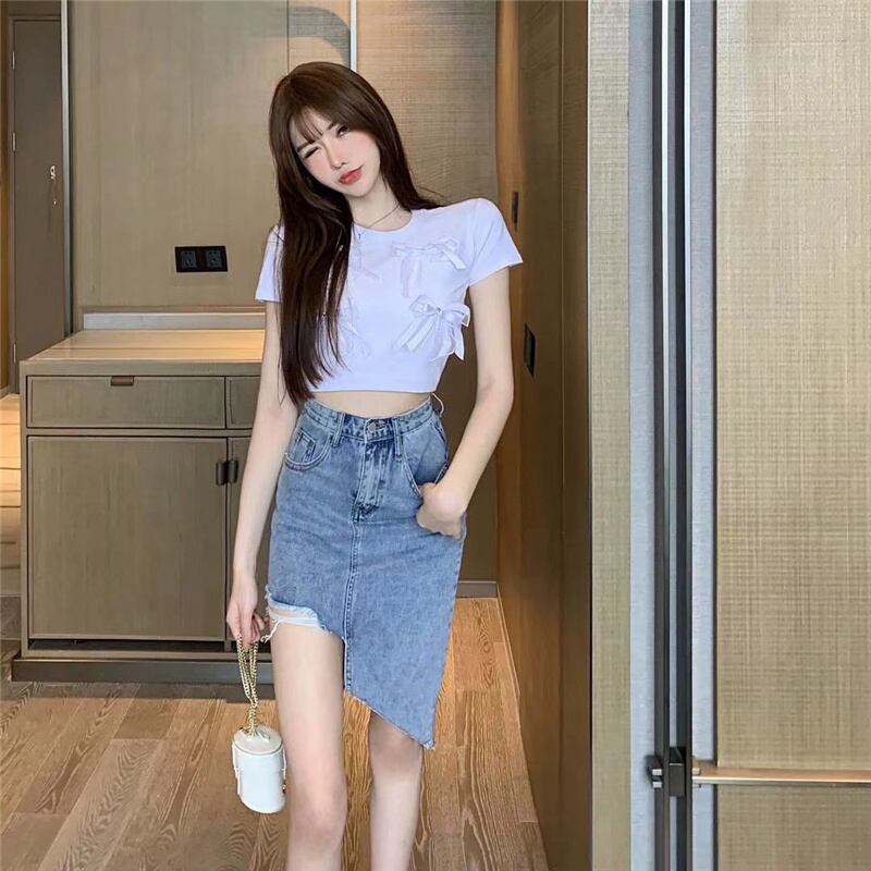 スタイルサマーショートリボンTシャツ トップス ハイウェストウェストスカート 夏物 Xiaofeijia80040089937