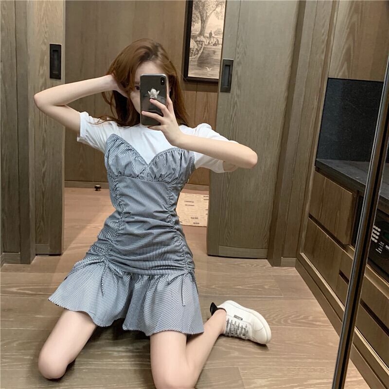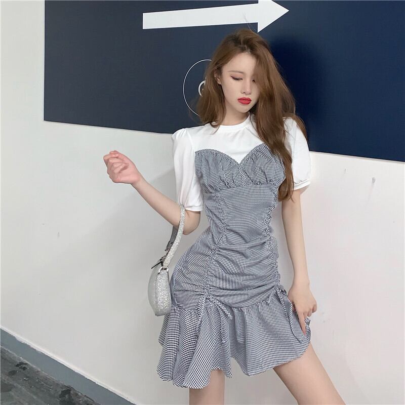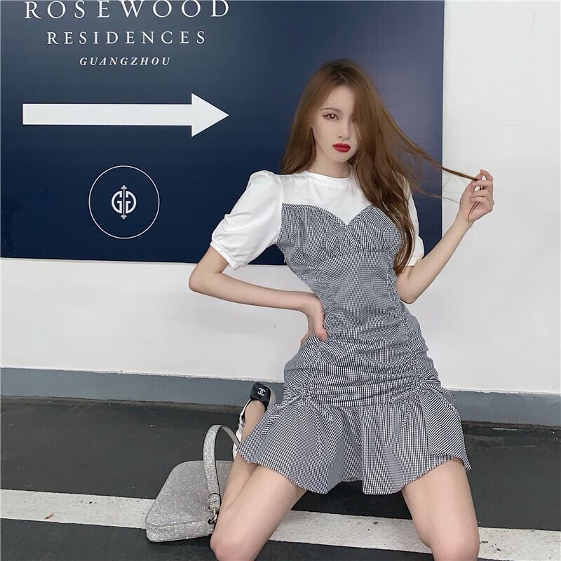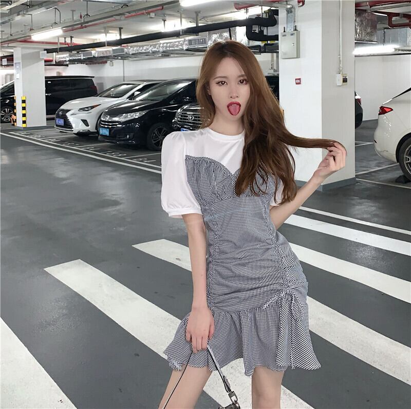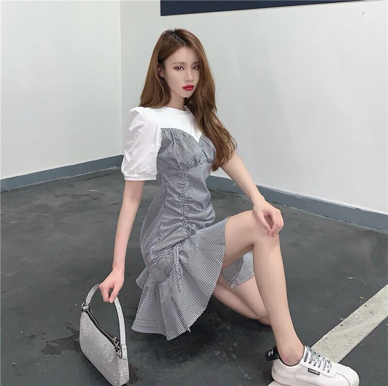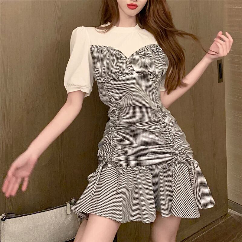 ラウンドネックスリーブ格子柄サマードレス ギャザーAラインショートスカート 夏物 Oネック ステッチ Xiaofeijia49972376524