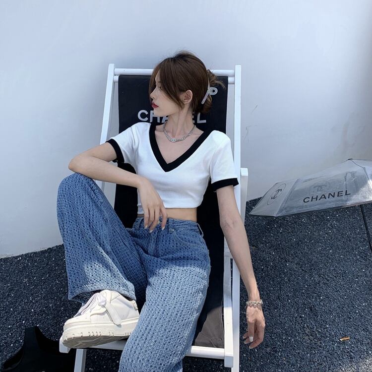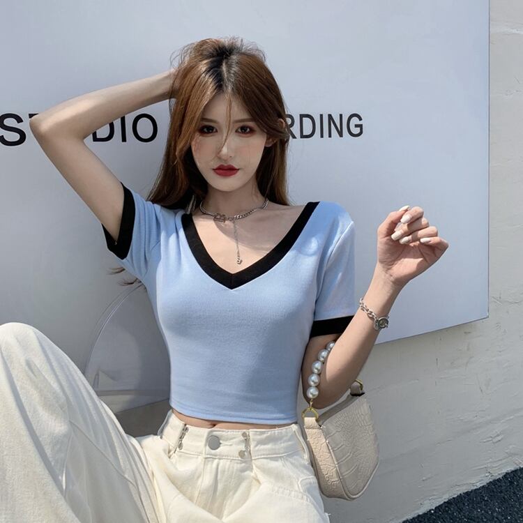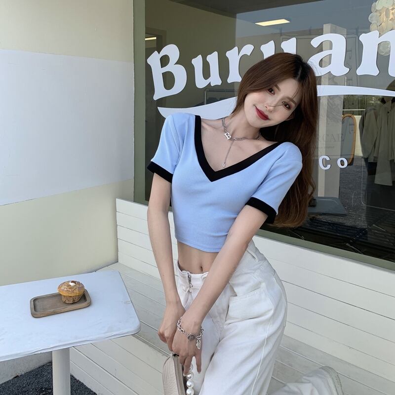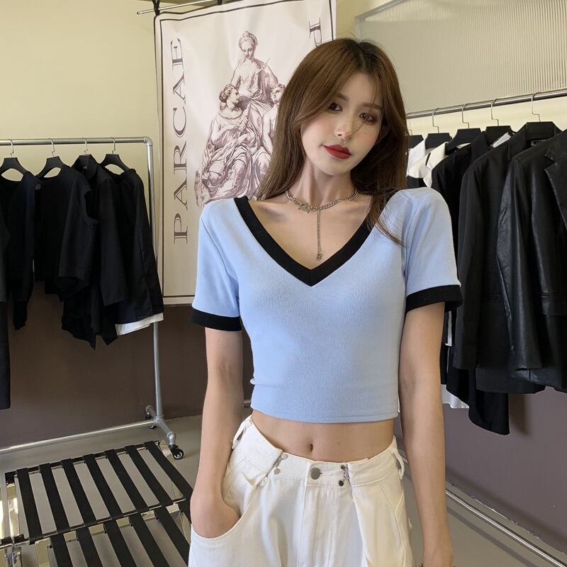 トップス ショートVネックカラーTシャツ シャツ サマーレディース 夏物 Xiaofeijia92040049365