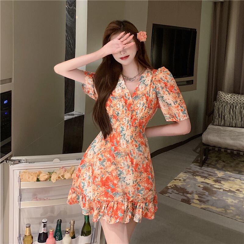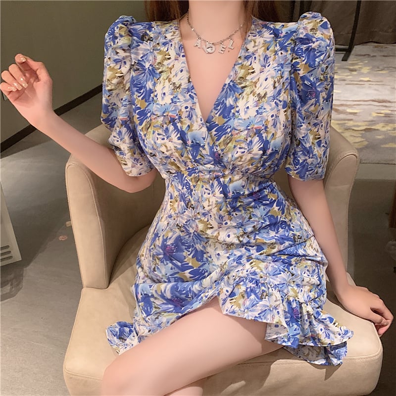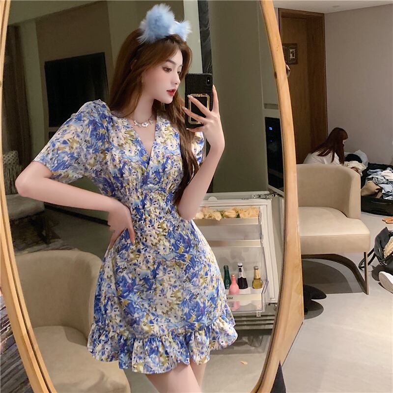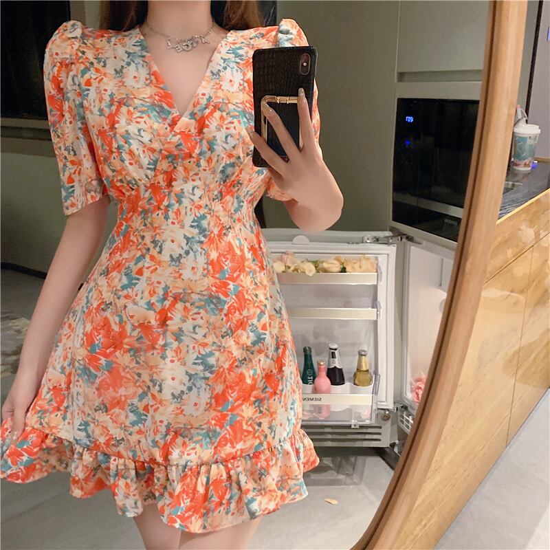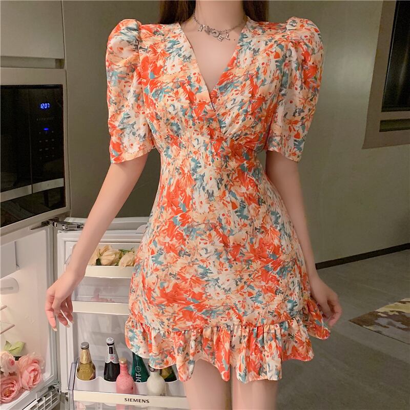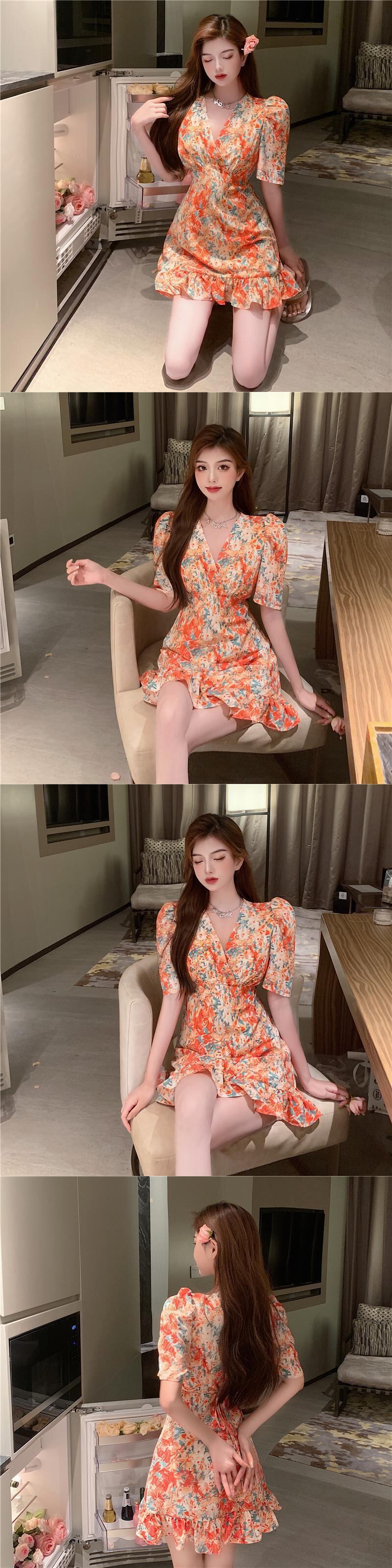 サマースタイルVネックフローラルハイウェストドレス 夏物 花柄 Xiaofeijia87630906187