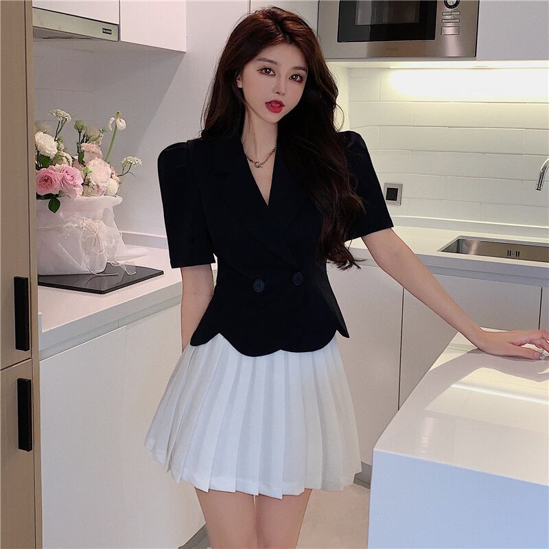 スリーブウェストVネックショートジャケット プリーツスカート サマー 夏物 Xiaofeijia93974405335