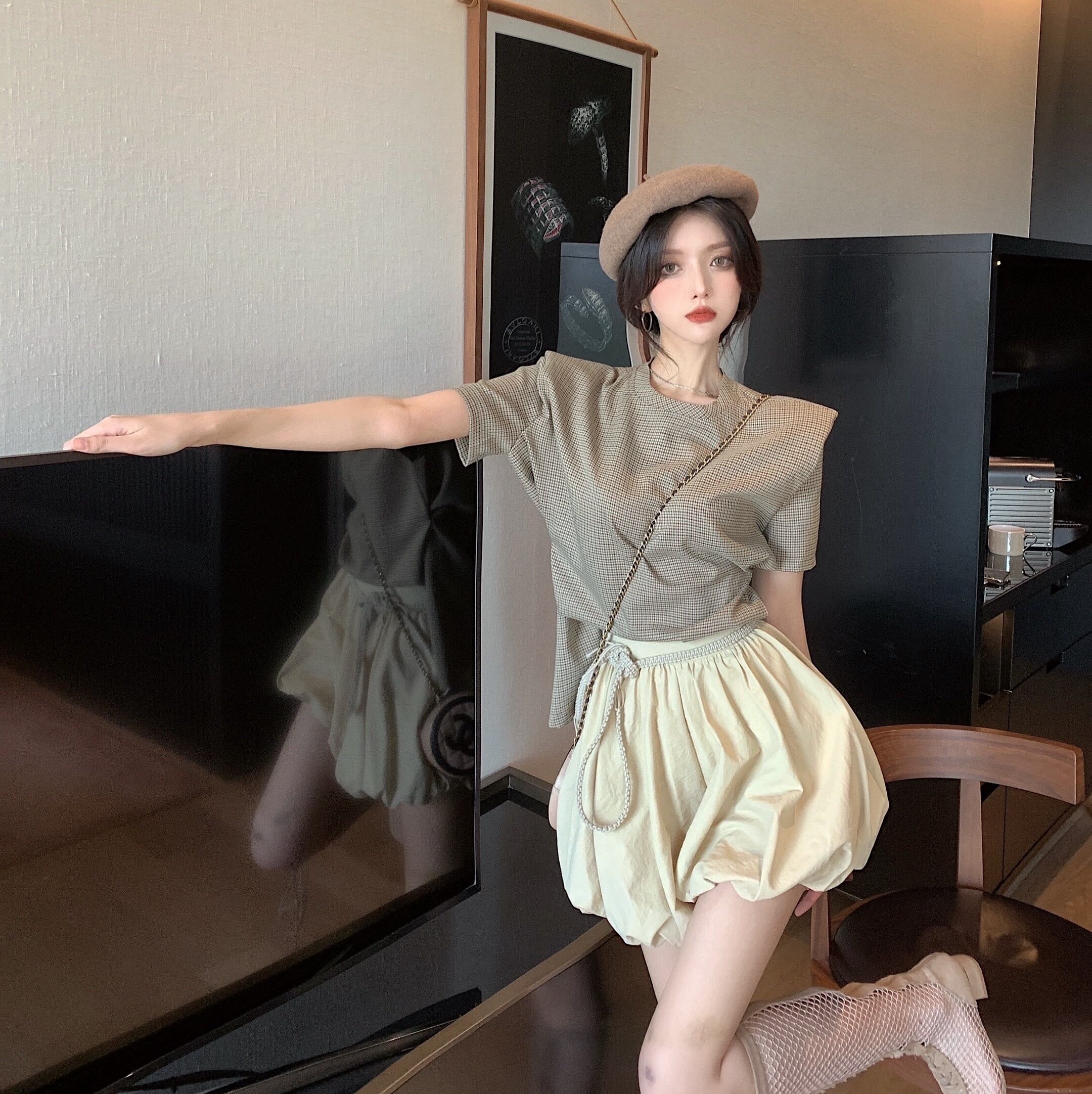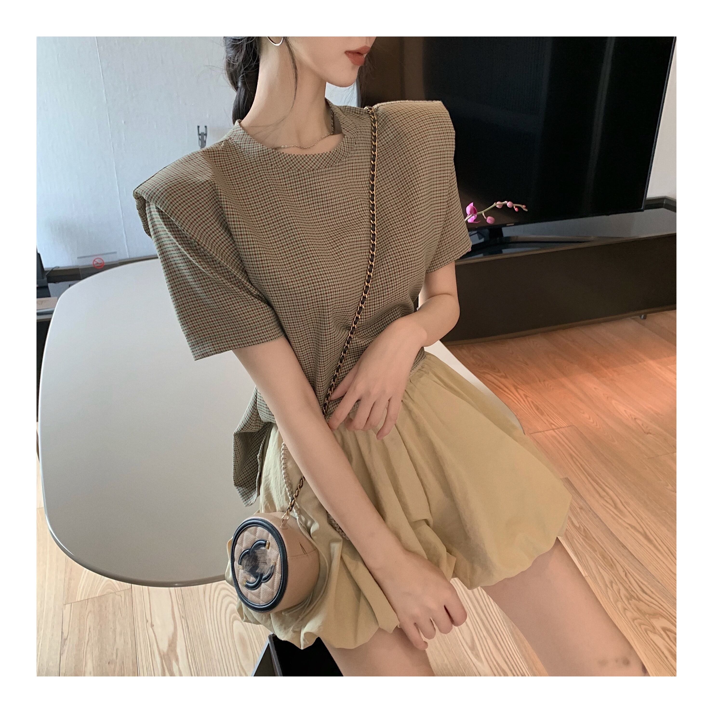 スタンダードTシャツ サマー薄手格子柄ハイウェストウェスト レトロ 夏物 Xiaofeijia46200074106