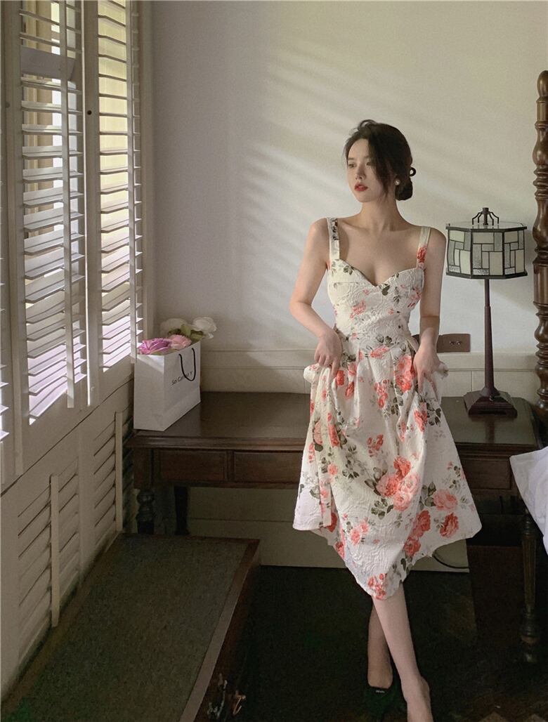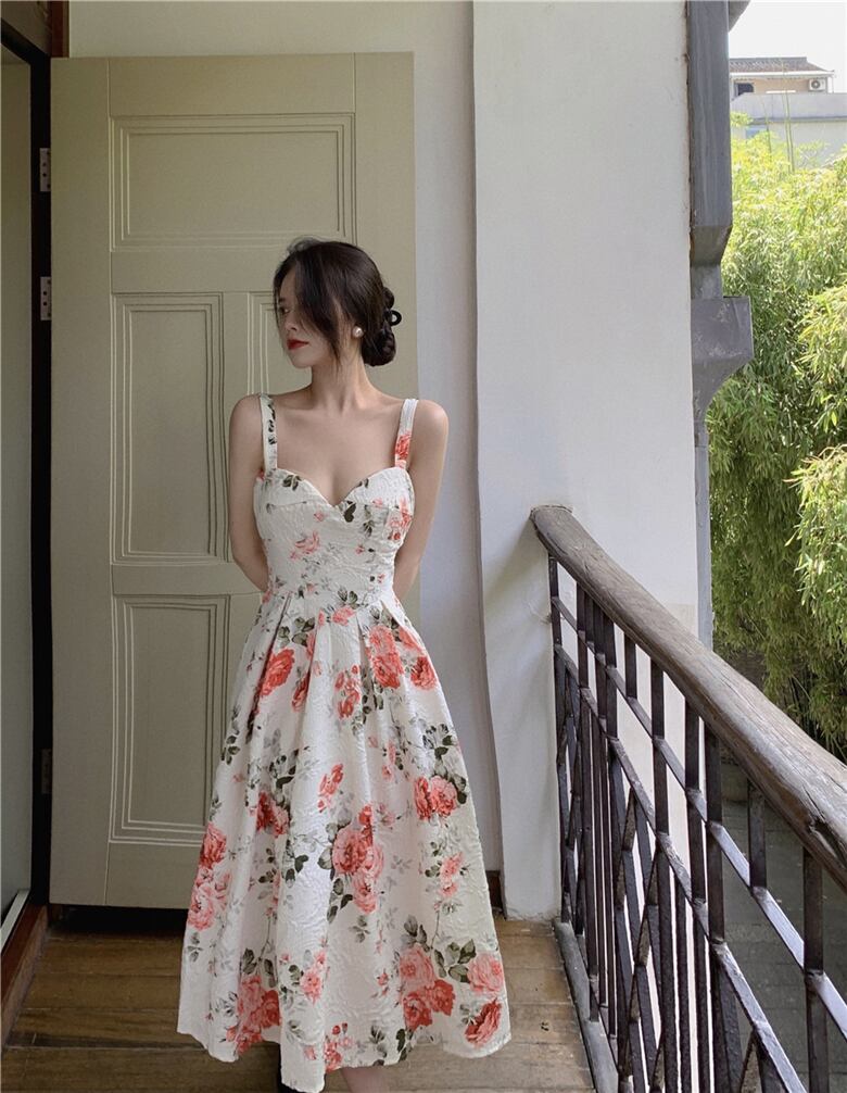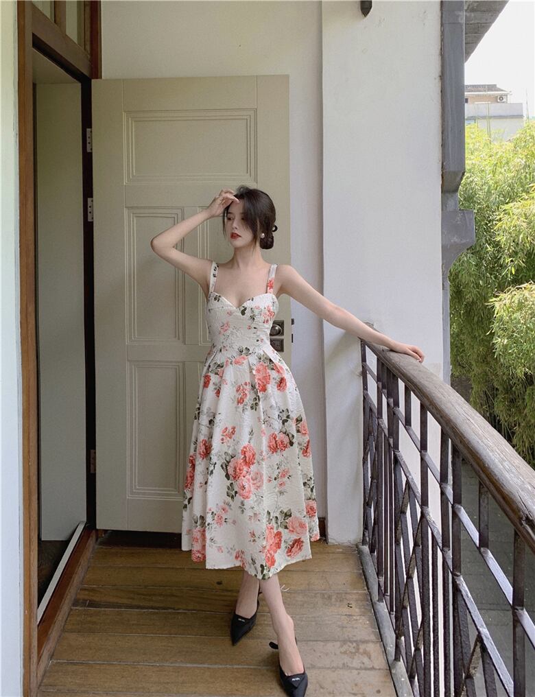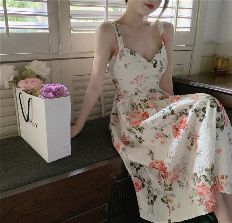 Vネックフローラルサマードレス プリーツウェストスカート 夏物 花柄 Xiaofeijia33428008427