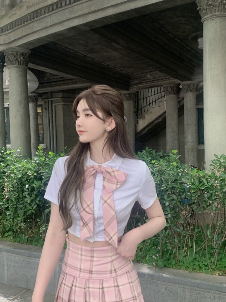 スタイルスカート リボンショートシャツ プリーツサマー ピンク 夏物 Xiaofeijia48965386224