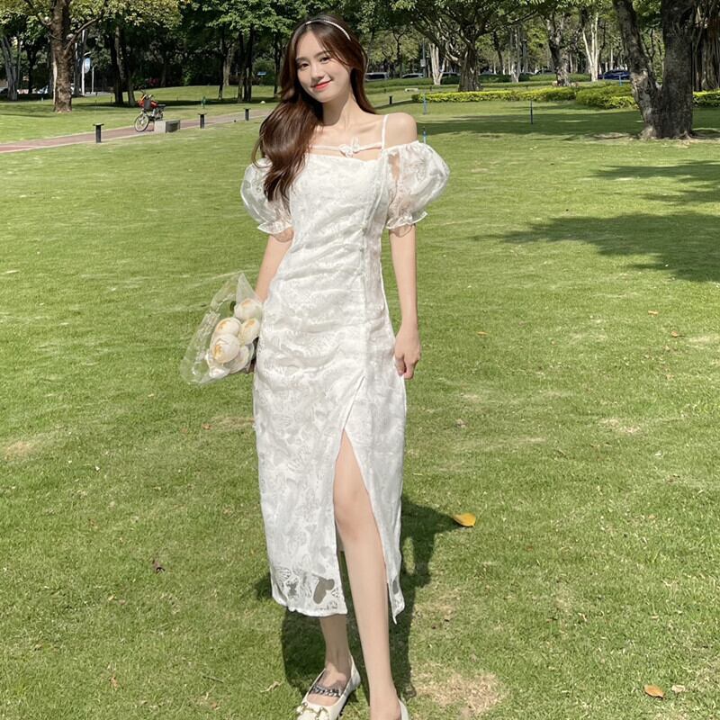 ロングスカート サマーButterflyデザイン スリーブスリットウェストホワイトドレス 夏物 Xiaofeijia74127763365