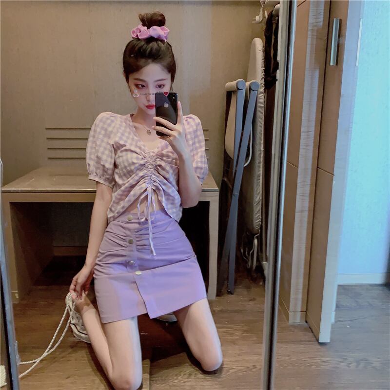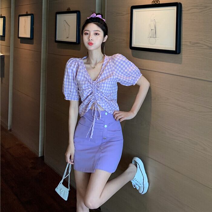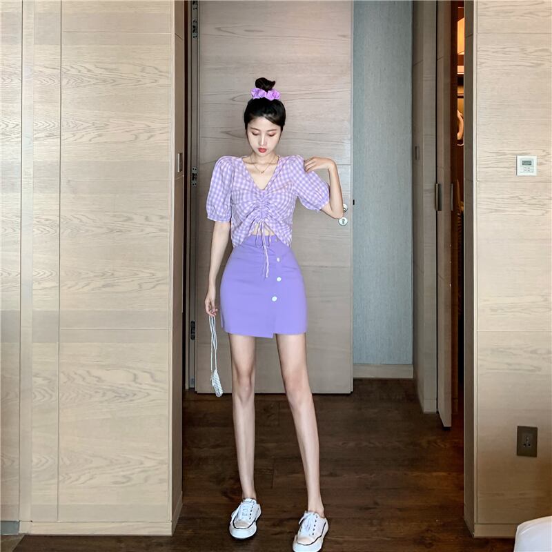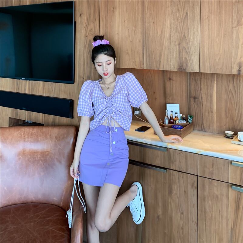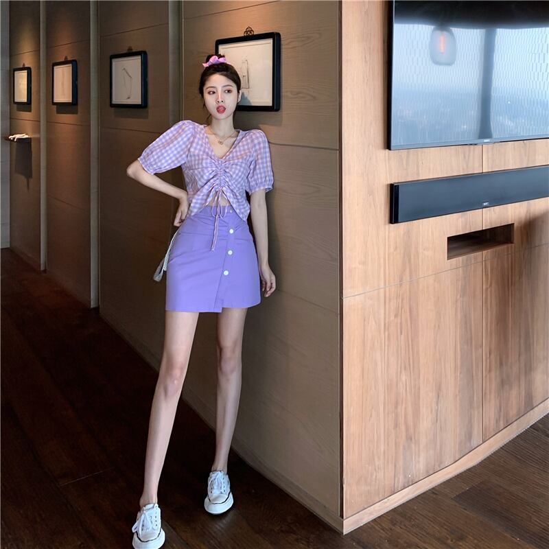 Vネックギャザー格子柄スリーブシャツ ウェストAラインショーツ スカート ブルマー パープル Xiaofeijia95218657696