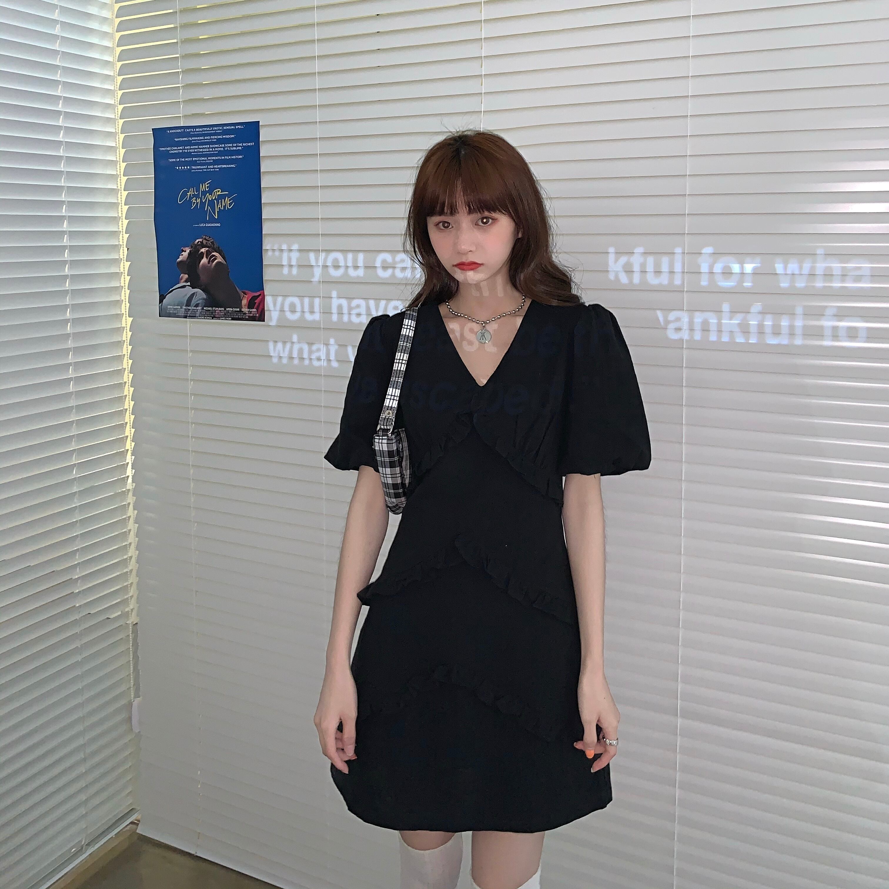 スタンダードスリーブドレス ウェスト薄手VネックレースAラインスカート レトロ Xiaofeijia83552092296