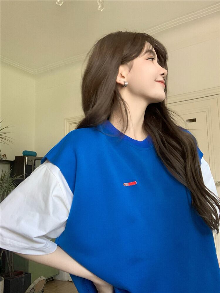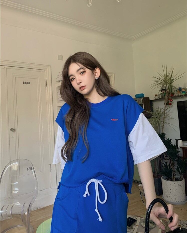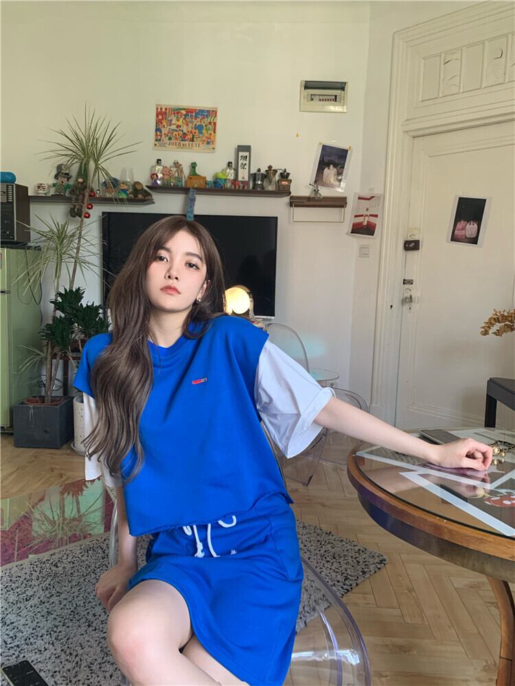 ブルーカジュアルスカート サマーホワイトTシャツ ラウンドネックノースリーブセーター ストレッチウェスト エラスティック 伸縮 夏物 Oネック Xiaofeijia1605737309