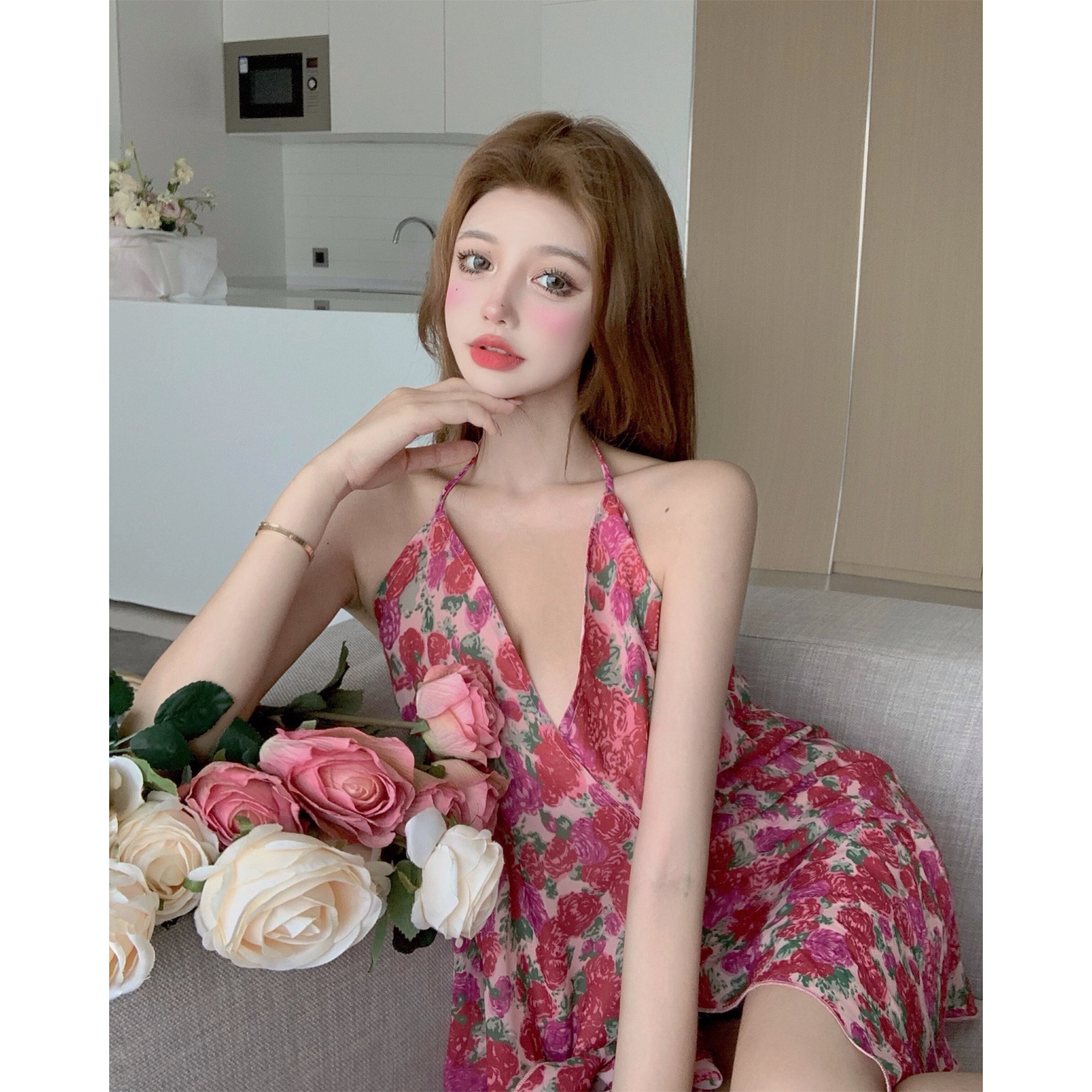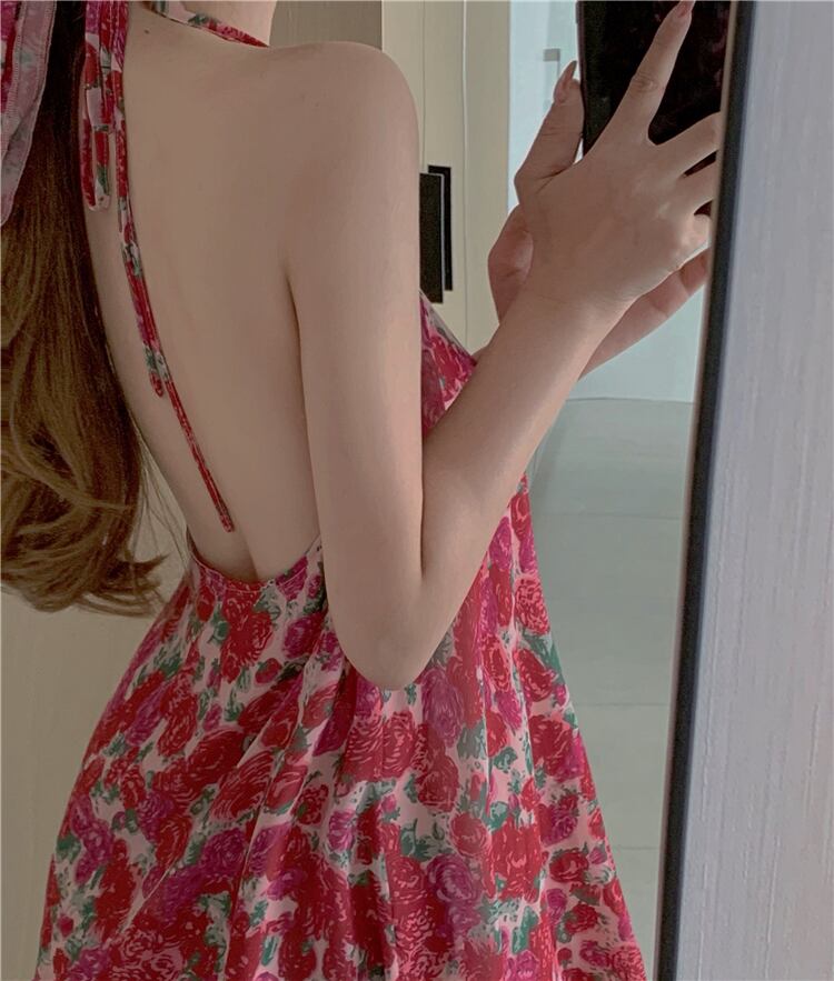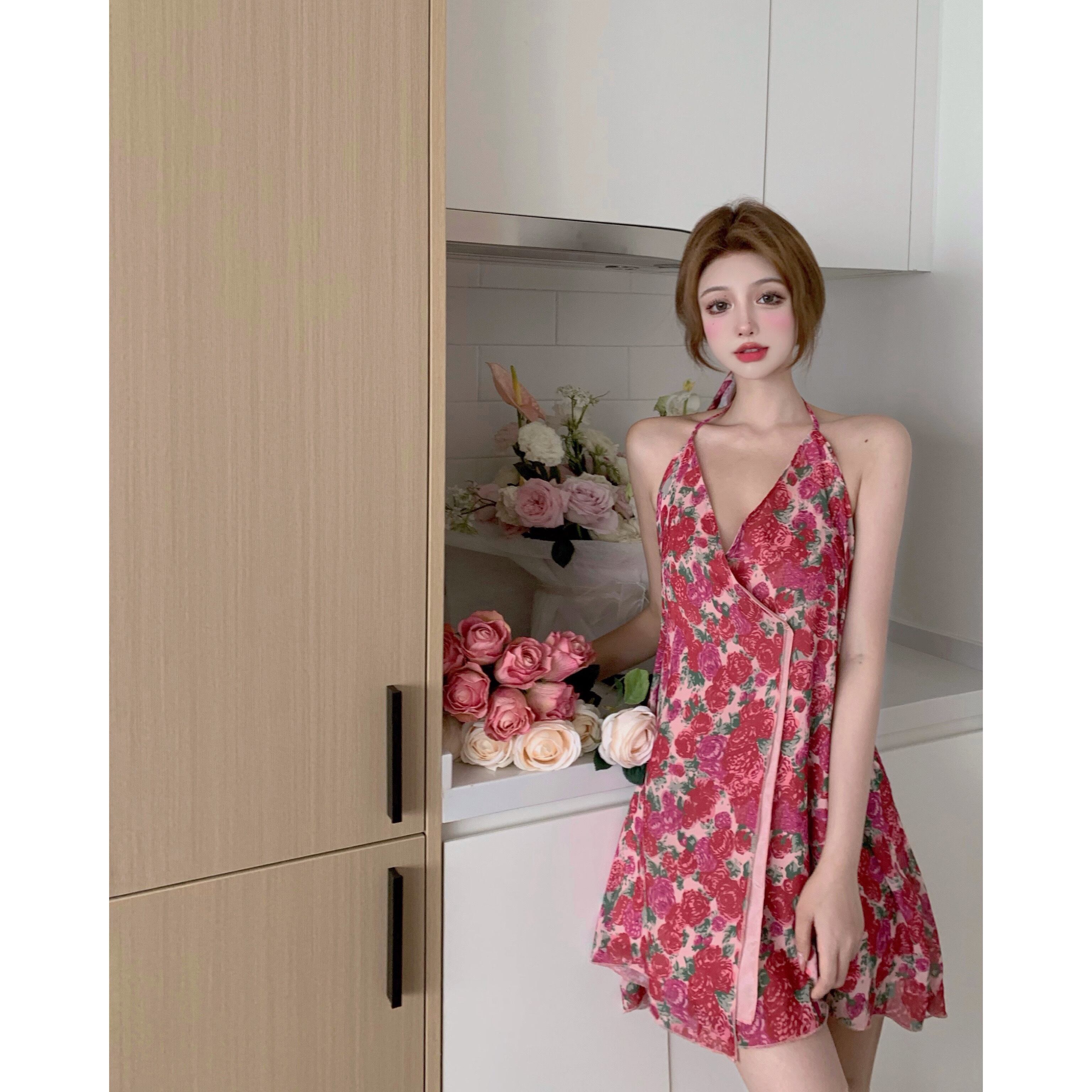 ホルターVネックスカート ショートフローラルドレス サマー 夏物 花柄 Xiaofeijia89399039577