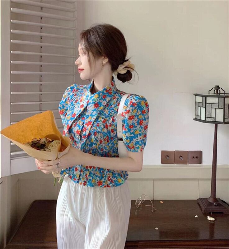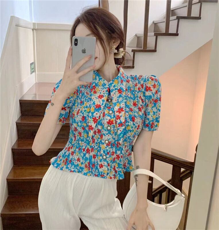 サマーカラーFlowerデザイン ショートスリーブシャツ プリーツウェストトップス 夏物 フラワーデザイン Xiaofeijia58702666821