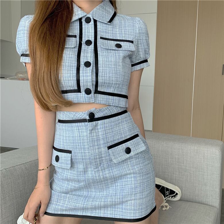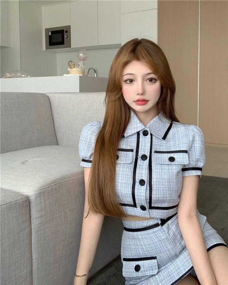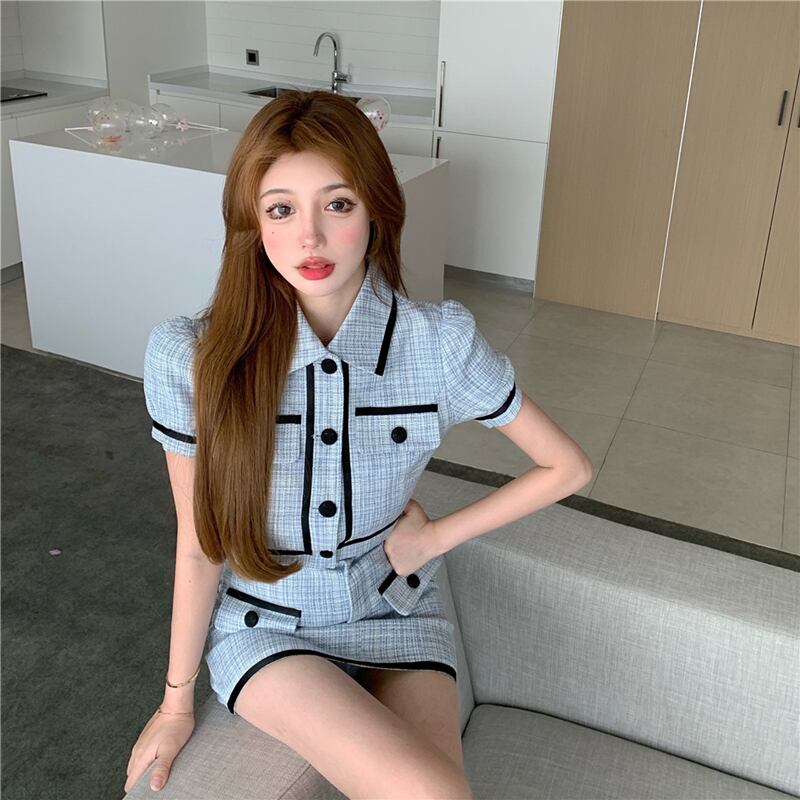 ブルーサマースリーブショートシャツ ハイウェストウェストスカート 夏物 Xiaofeijia54052827097