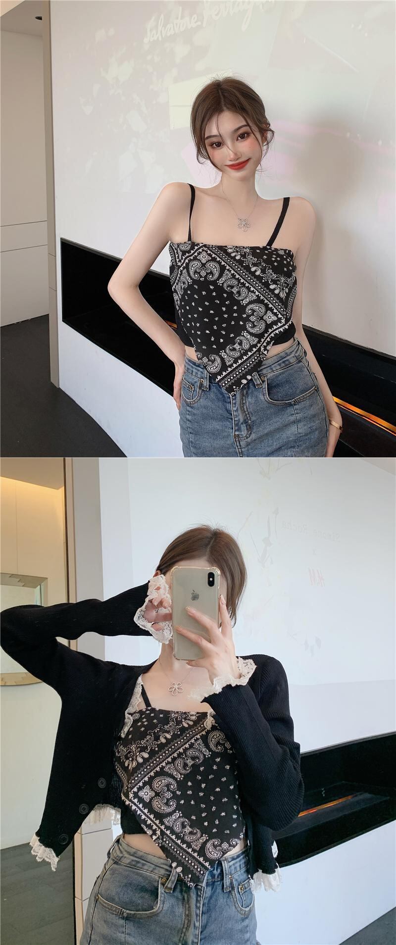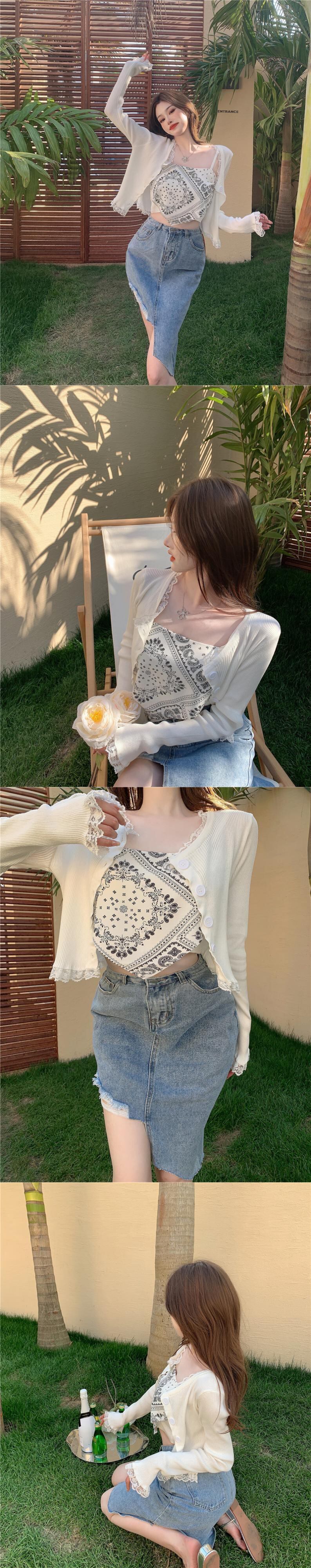 スタンダードFlowerデザイン トライアングルショートニットレースカーディガンスカート サマー レトロ 夏物 フラワーデザイン Xiaofeijia72178947847