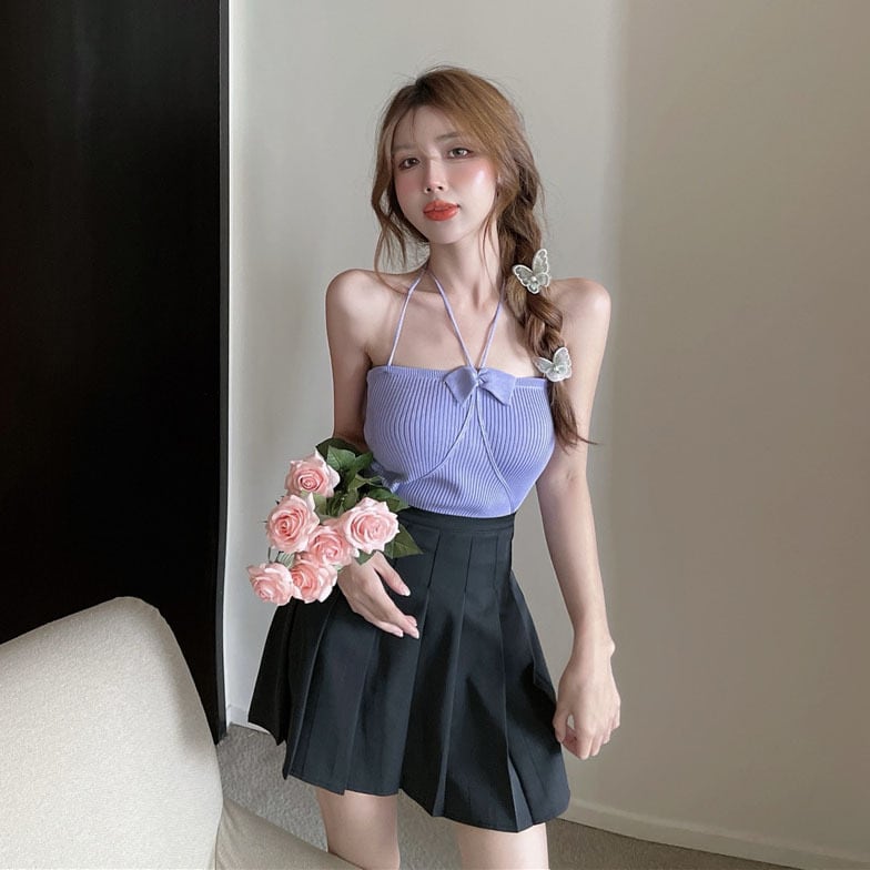 ホルターリボントップス ハイウェストウェストプリーツスカート セット Xiaofeijia34094428089
