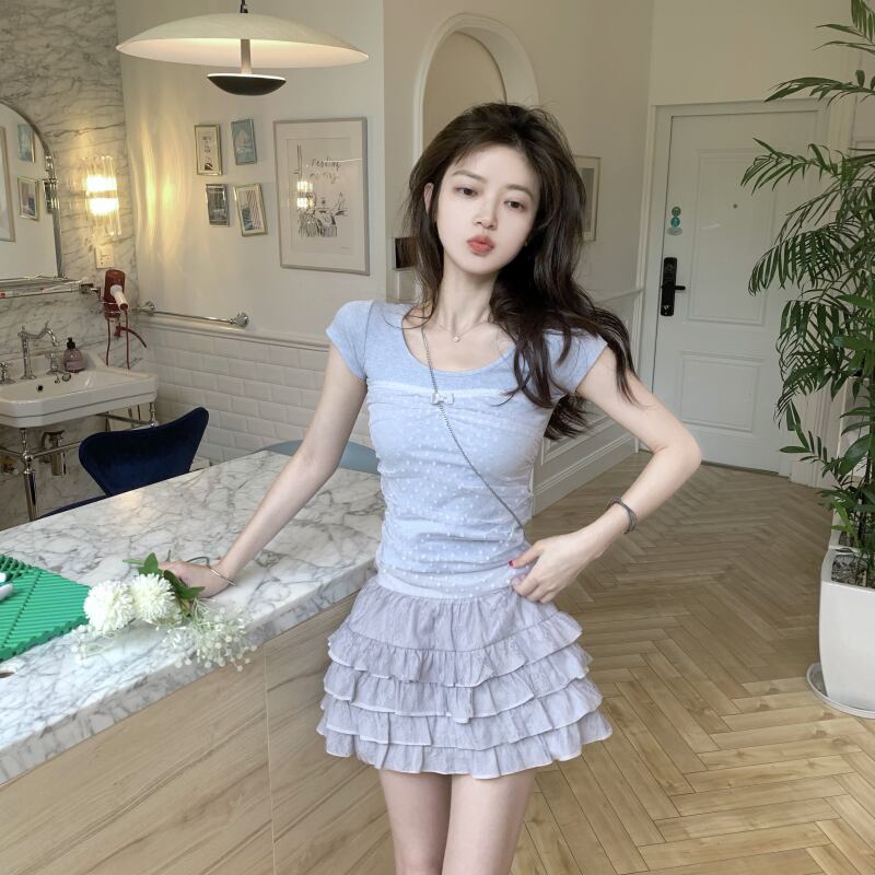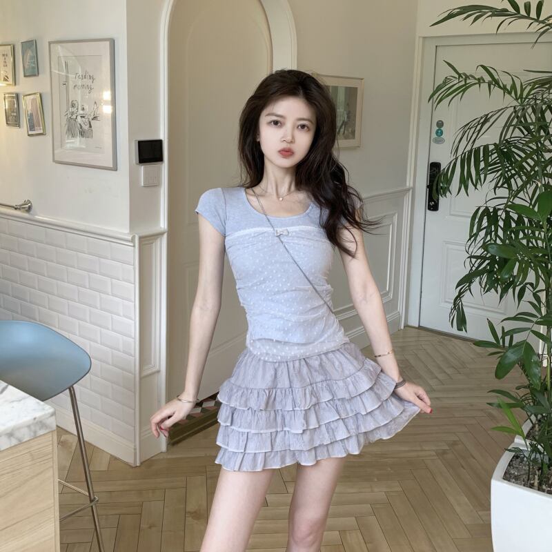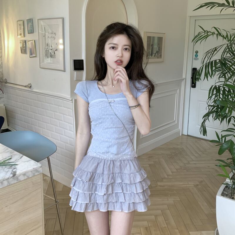 レースラウンドネックリボンTシャツ ハイウェストウェスト薄手スカート Oネック ステッチ Xiaofeijia38593924815