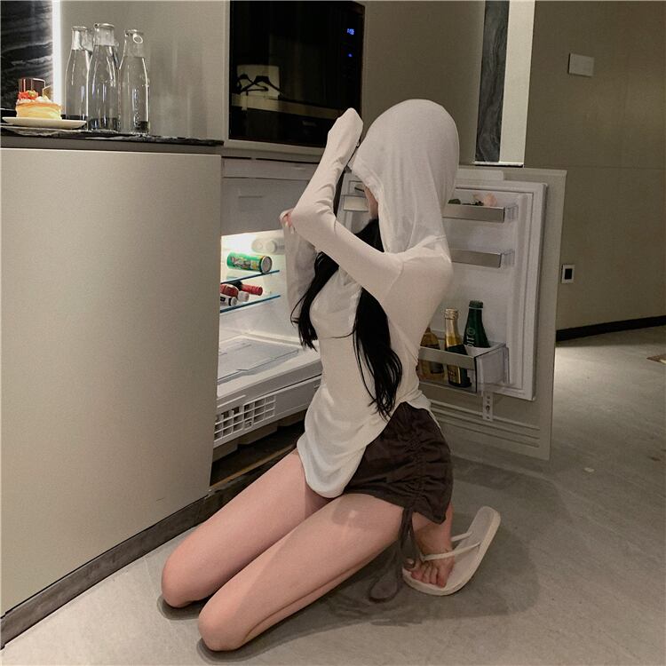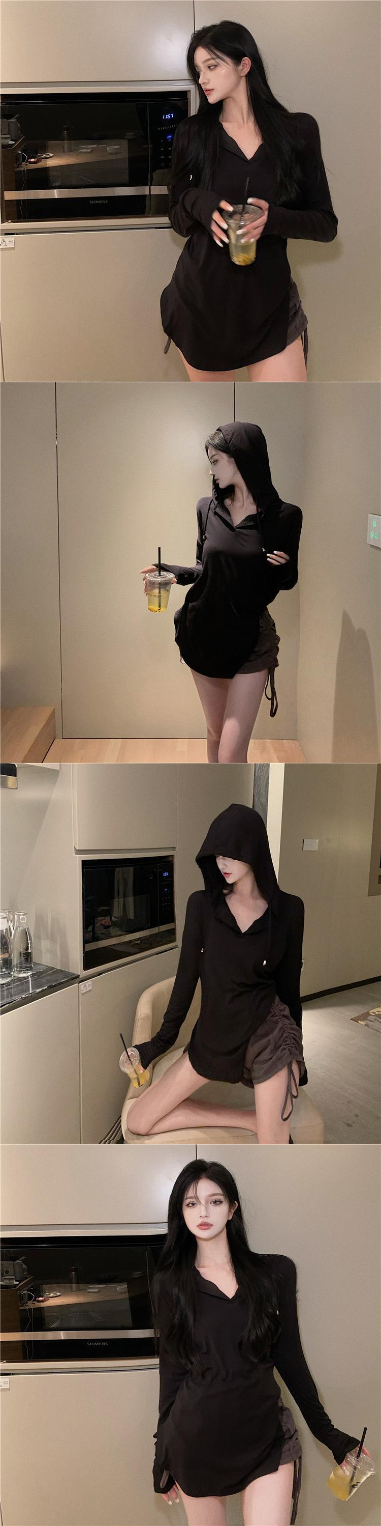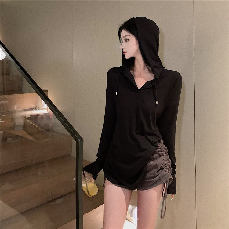 フードTシャツ サマー薄手スリムVネックトップス ロング 夏物 Xiaofeijia23865065804