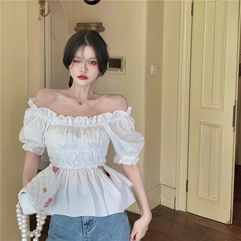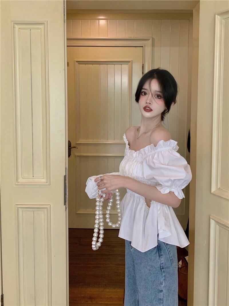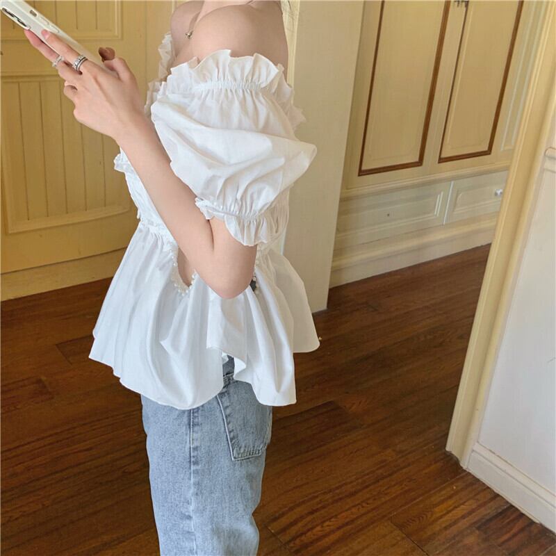 ホワイトブラウス ウェストパールショートトップス スリーブシャツ サマー 大人ガーリー スウィート キュート カジュアル 夏物 真珠 Xiaofeijia80325688056