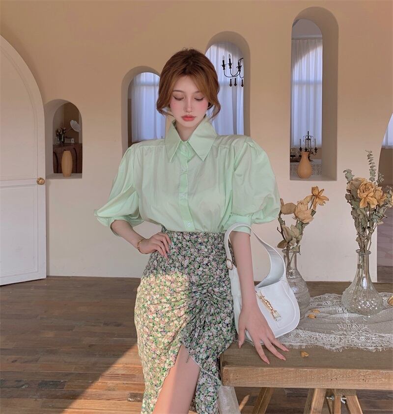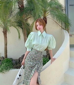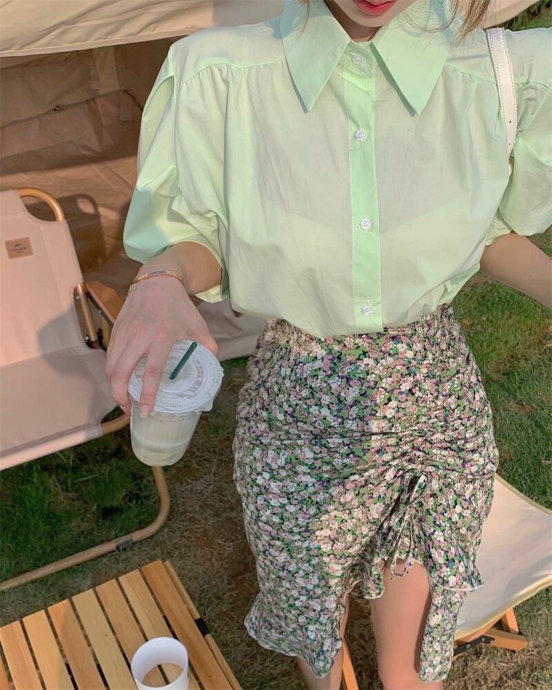 サマーグリーンスリーブシャツ ギャザーフローラルストレッチウェストスカート エラスティック 伸縮 夏物 花柄 Xiaofeijia53739350769