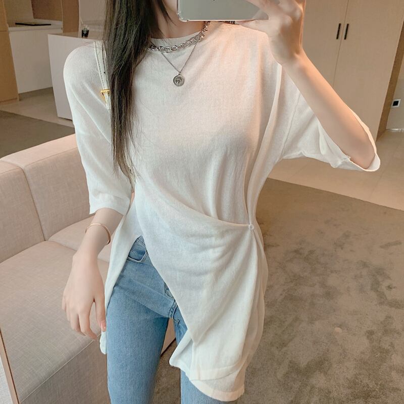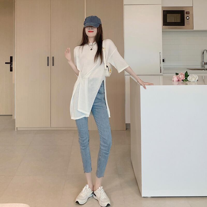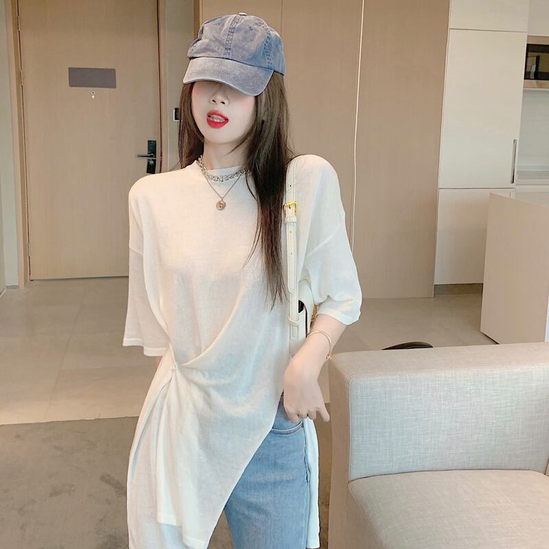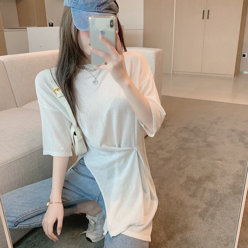レッドTシャツ サイドスリットルーズラウンドネックトップス サマー 夏物 Oネック Xiaofeijia94877113831