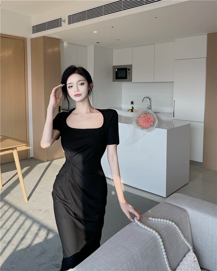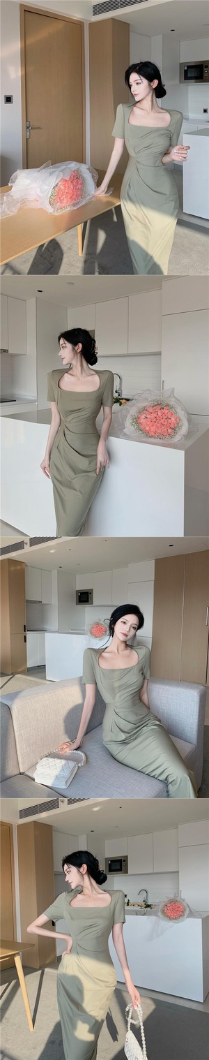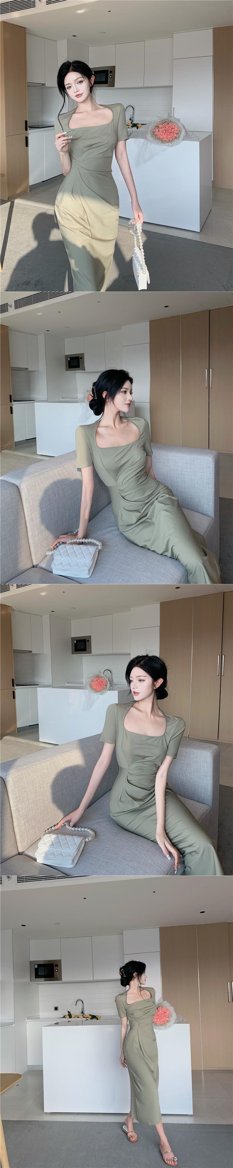 ウェストプリーツドレス カラーワンピース スクウェア Xiaofeijia85470073086