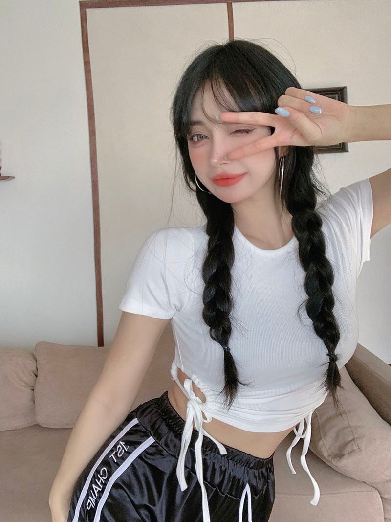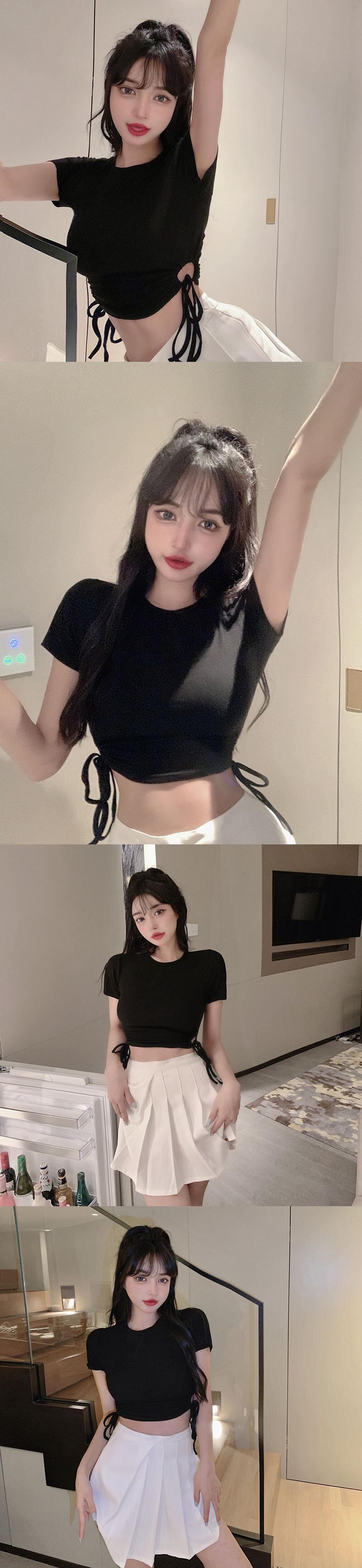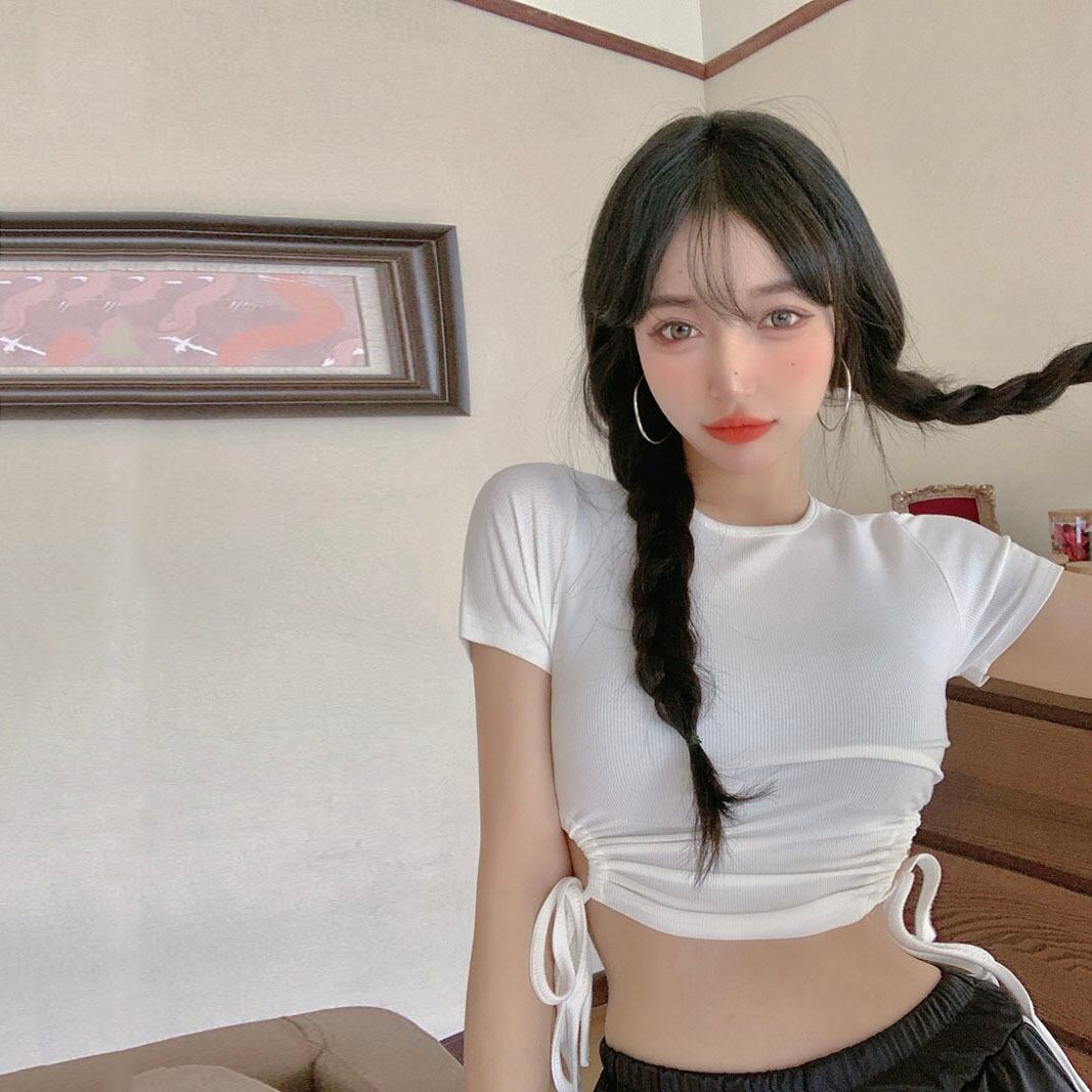 ギャザーホワイトショートTシャツ ハイウェストクロップトップ トップス Xiaofeijia44708028951