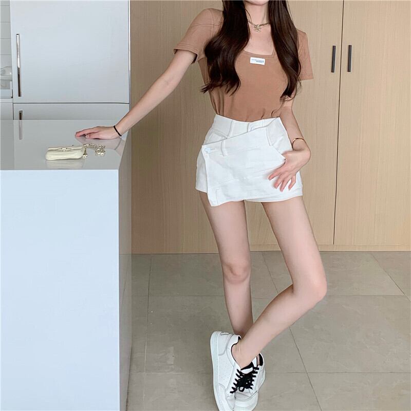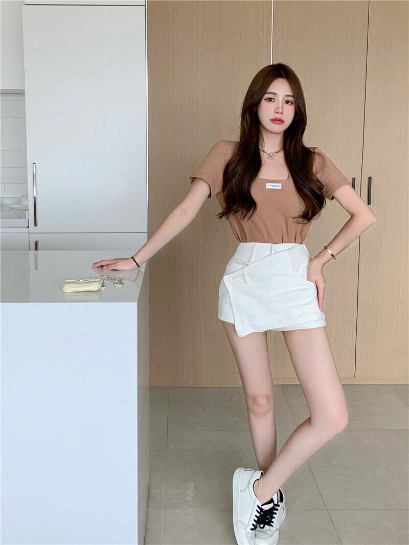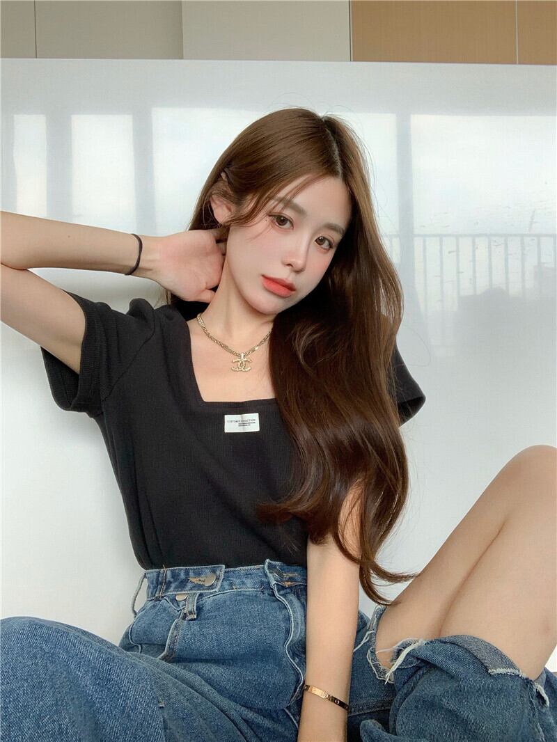 Tシャツ ストレッチルーズ薄手カラートップス エラスティック 伸縮 スクウェア Xiaofeijia91446972979