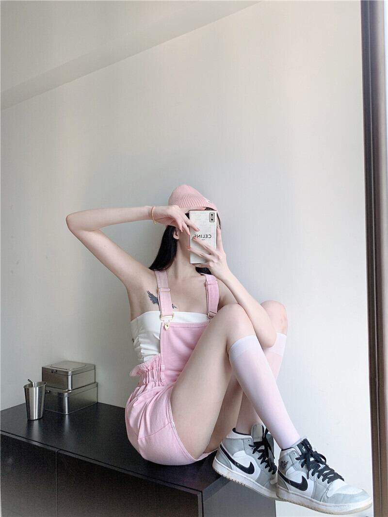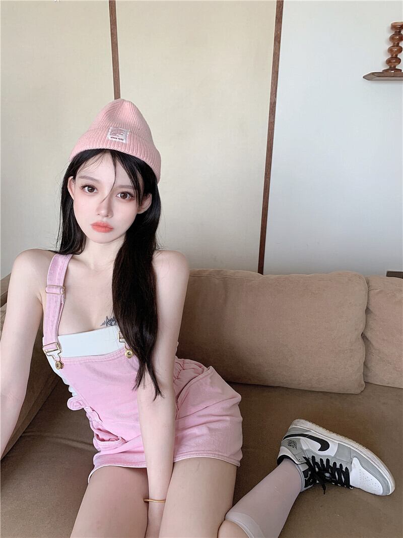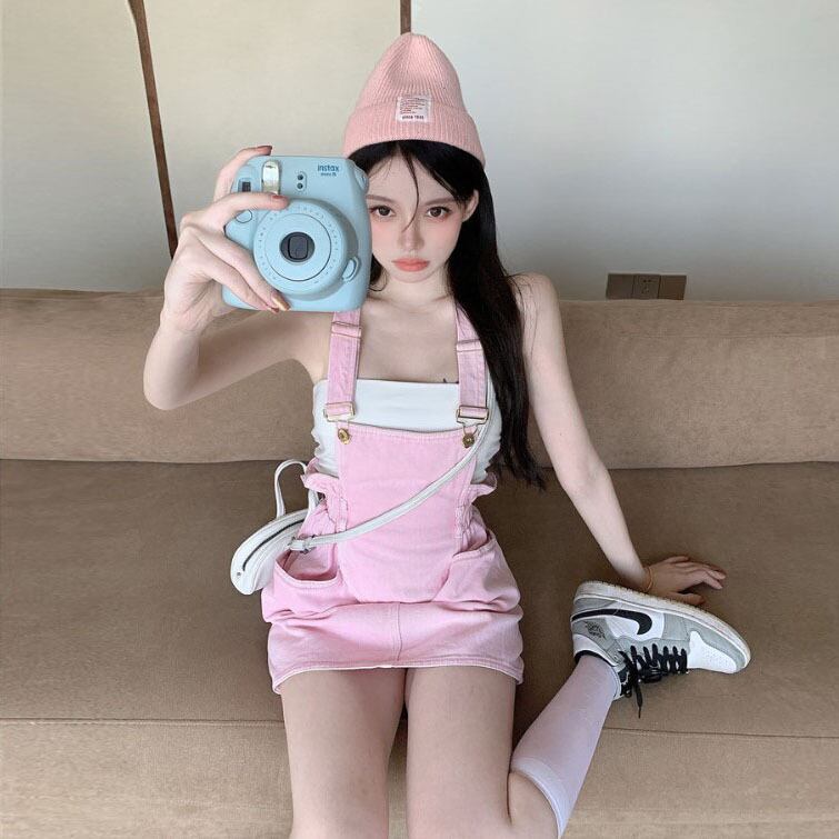スカート サマーオーバーオール ショートストレッチハイウェストウェストドレス ピンク エラスティック 伸縮 夏物 Xiaofeijia22492989378