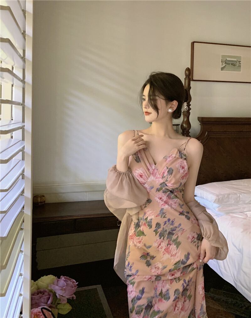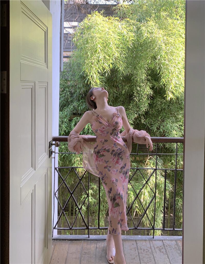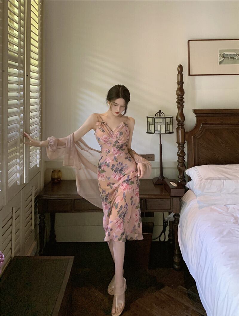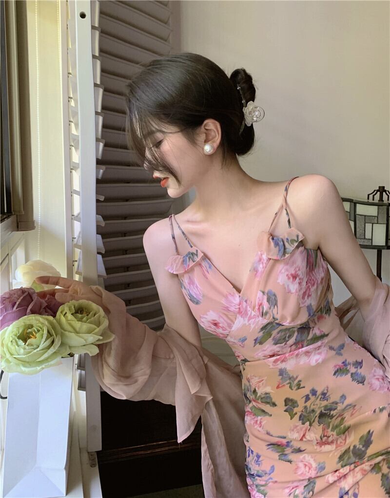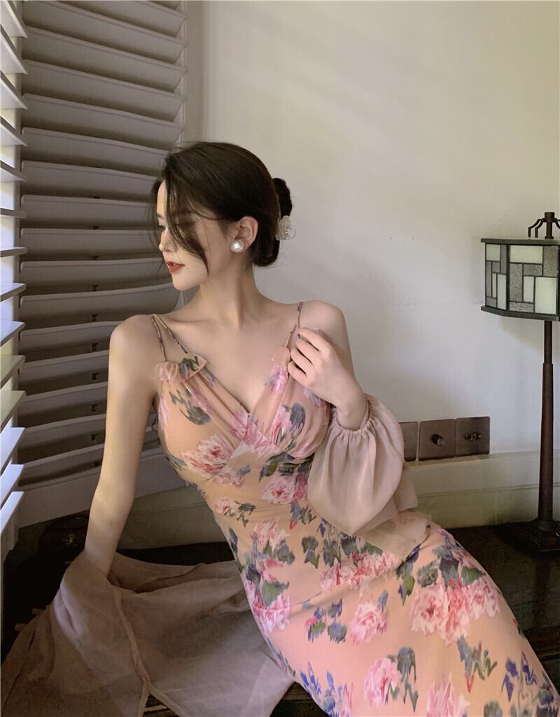 プリーツウェストスリムプリントシフォンドレス エレガント Xiaofeijia74068487358
