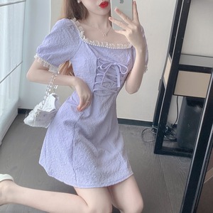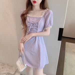 パールカラージャカードドレス ウェストスカート サマー 夏物 真珠 パープル スクウェア Xiaofeijia56332133708