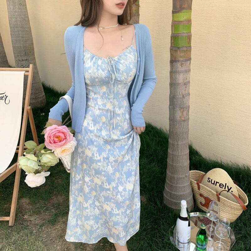 色:墨絵サスペンダースカート,ニットカーディガン