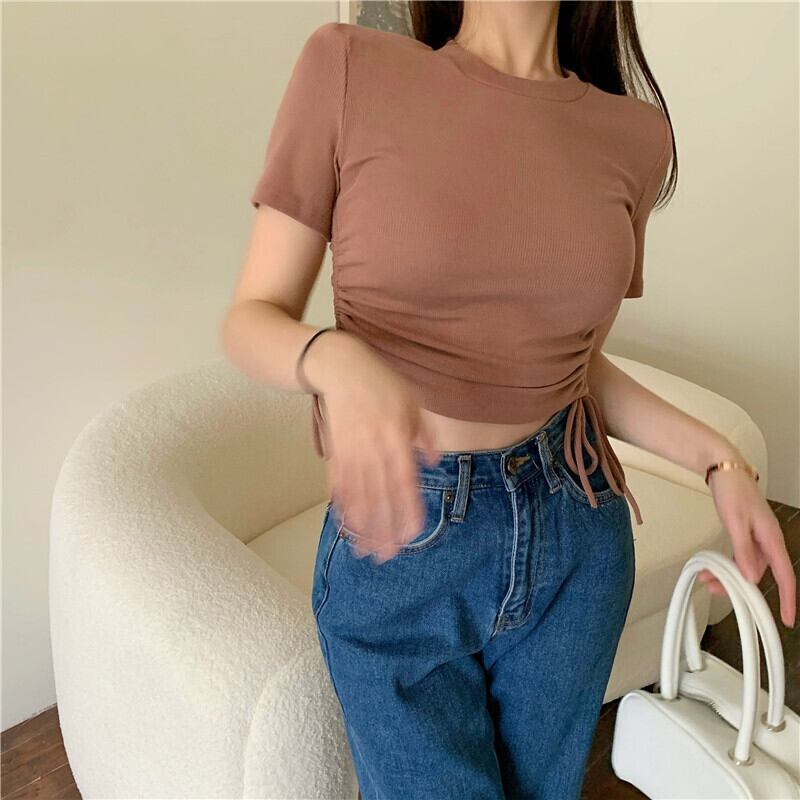クロップドトップス 薄手ラウンドネックギャザーショートTシャツ レディース Oネック Xiaofeijia18825870606