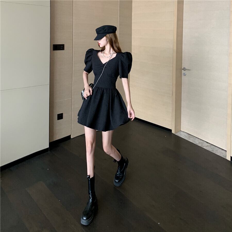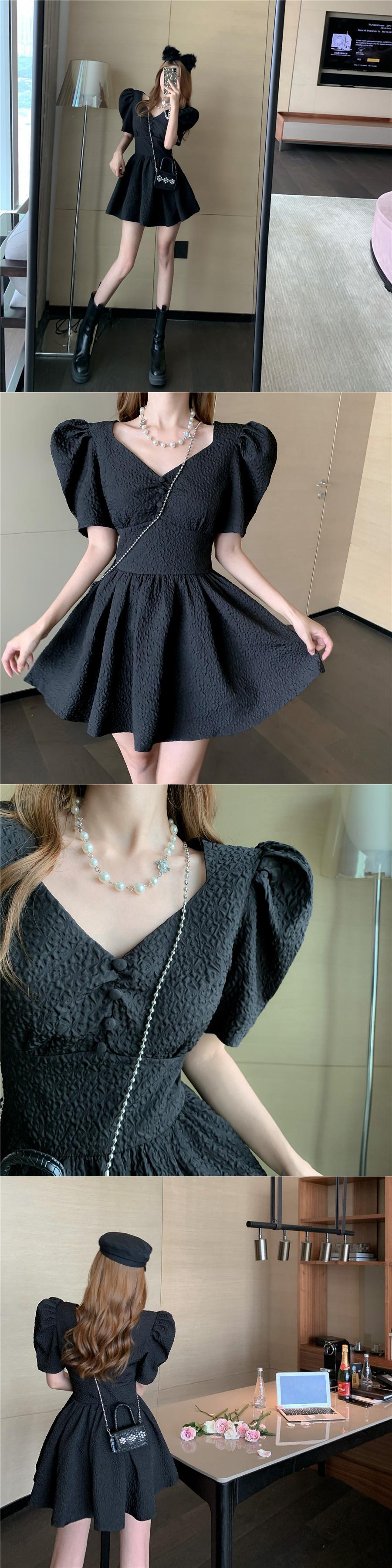 スタイルスタンダードスリーブVネックジャカードサマードレス ウェスト薄手Aラインブラックショートスカート レトロ 夏物 Xiaofeijia84394433680