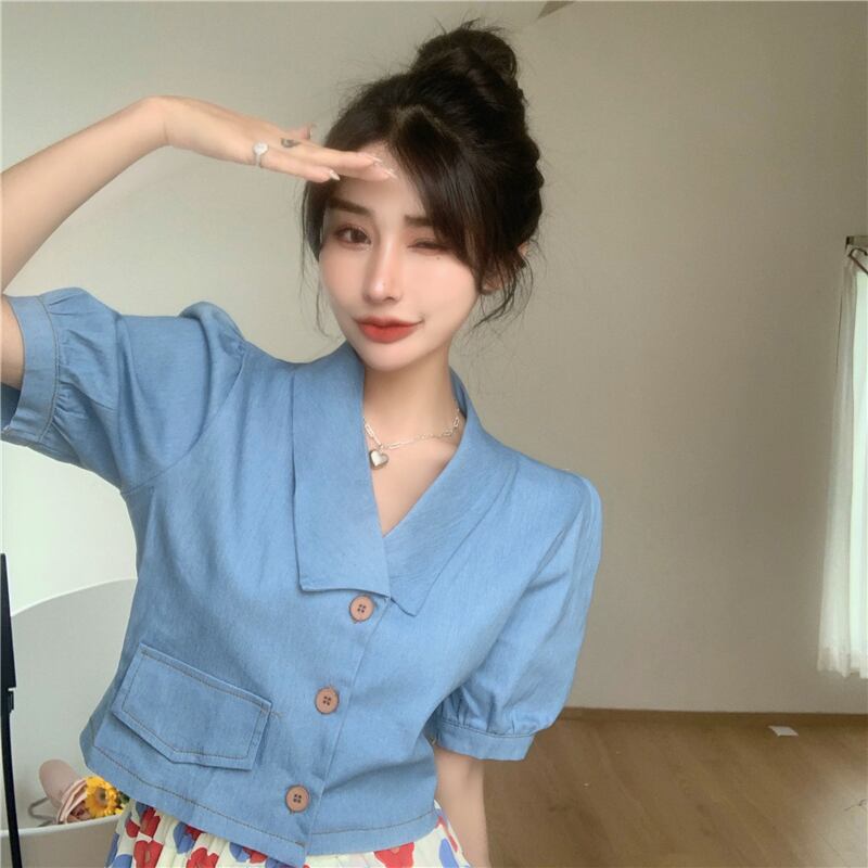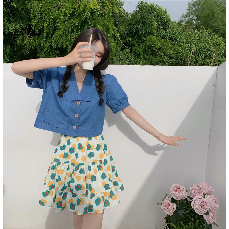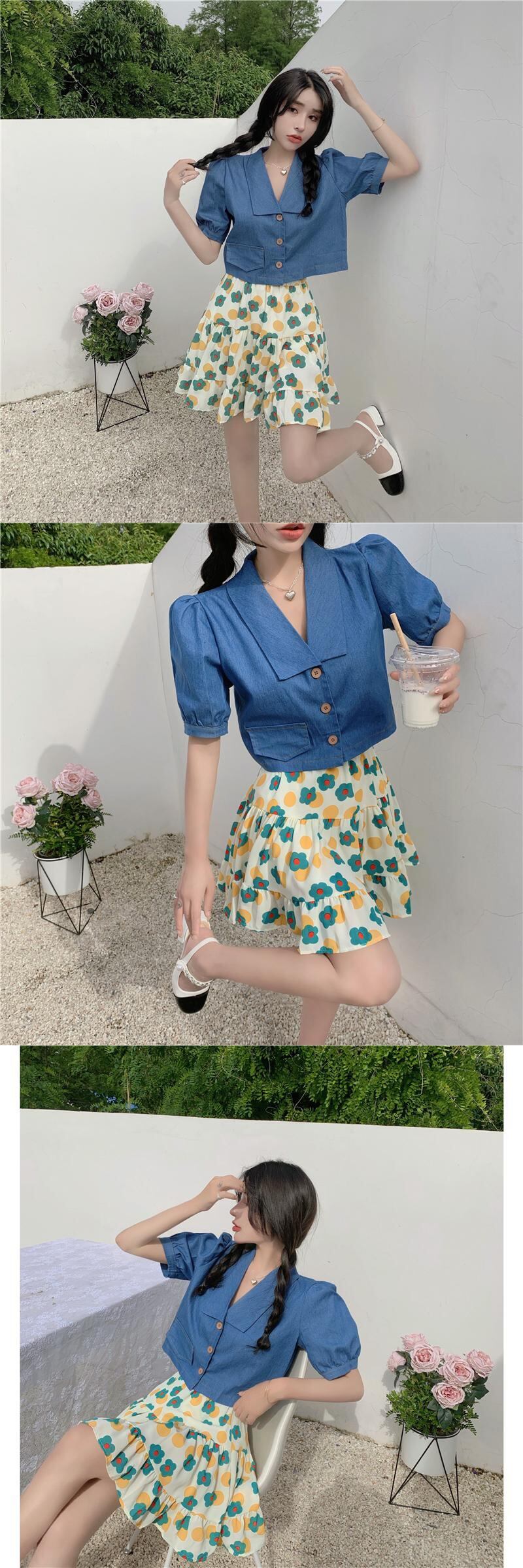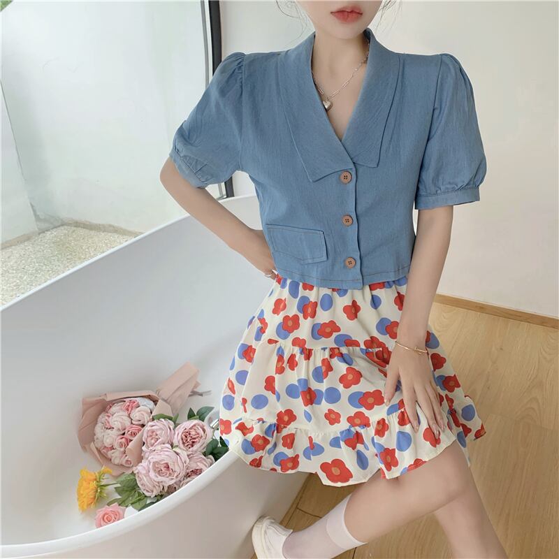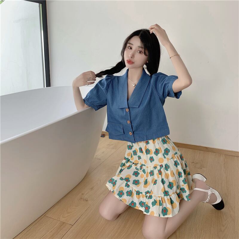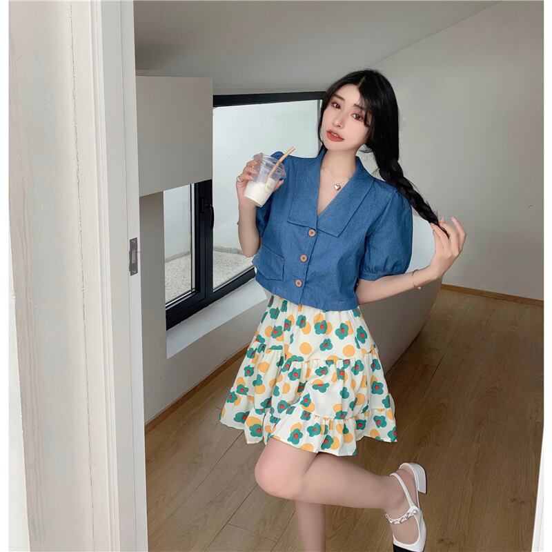 レッドスタイルサマーブルーショートジャケット ハイウェストフローラルスカート セット ストリート 夏物 花柄 Xiaofeijia43076384634