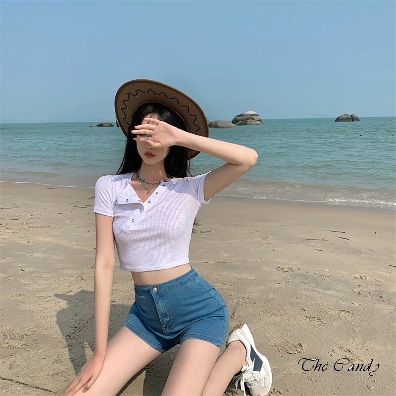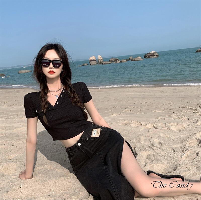 サマーカラーボタンニットトップス 薄手Tシャツ 夏物 Xiaofeijia44090667169