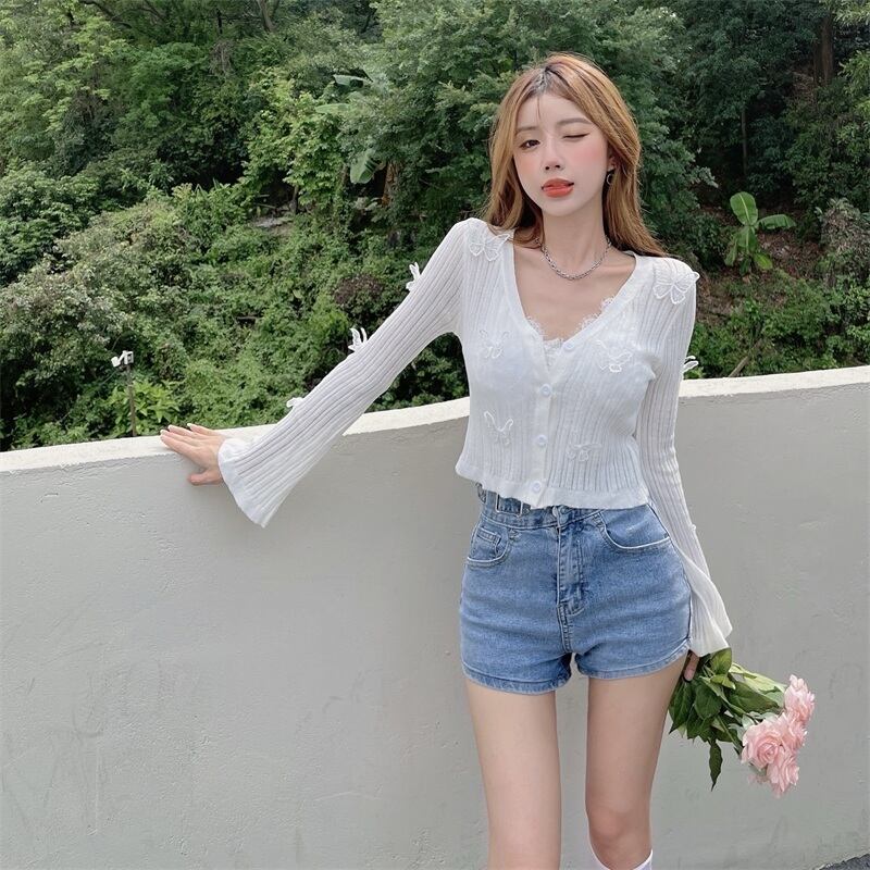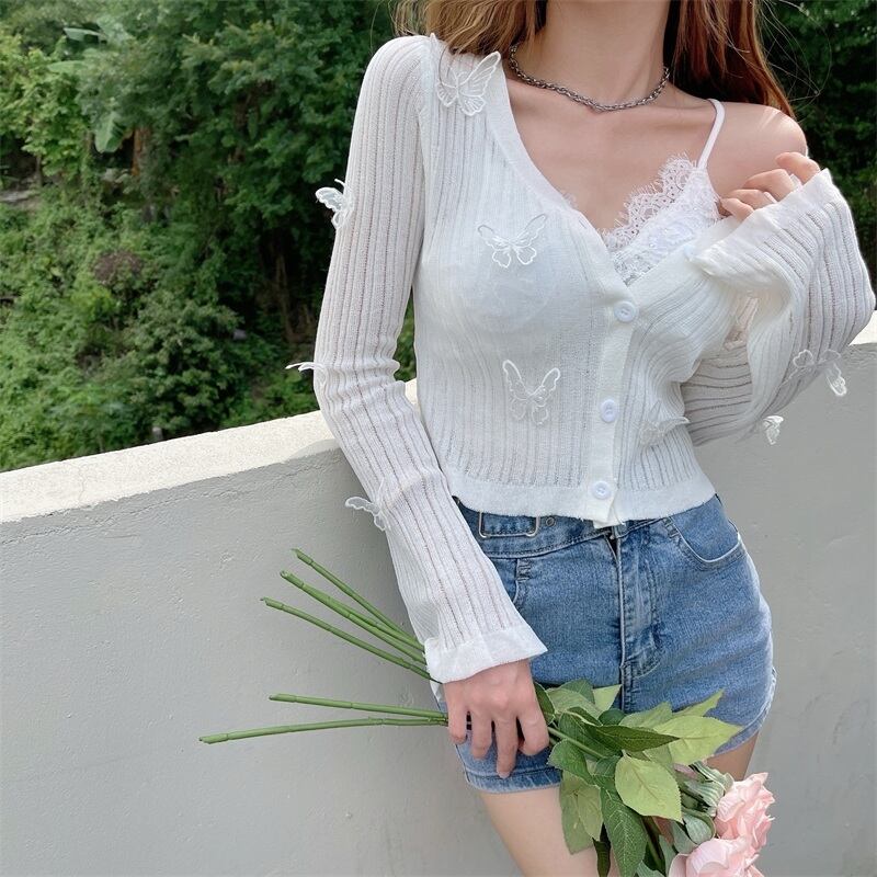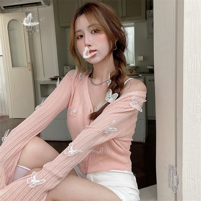 ショートスリムニットカーディガンジャケット サマー薄手ロング リボン 長袖 夏物 Xiaofeijia63700090180