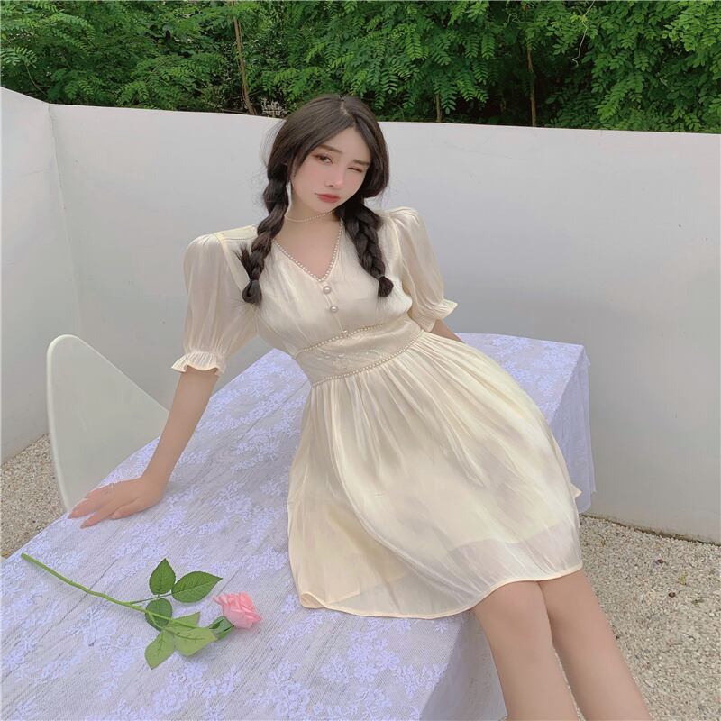 Vネックスタンダードスリーブドレス レトロ 大人ガーリー スウィート キュート カジュアル Xiaofeijia93288427987